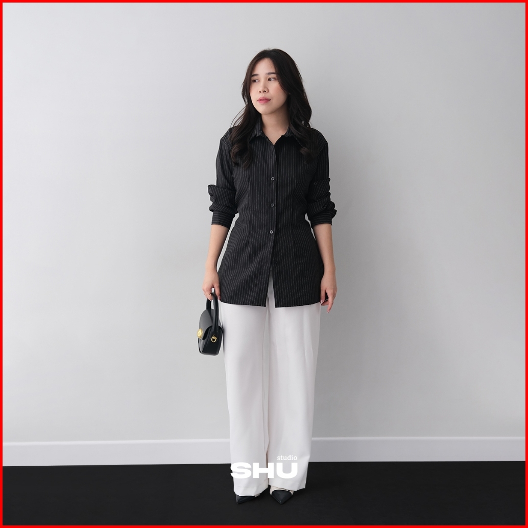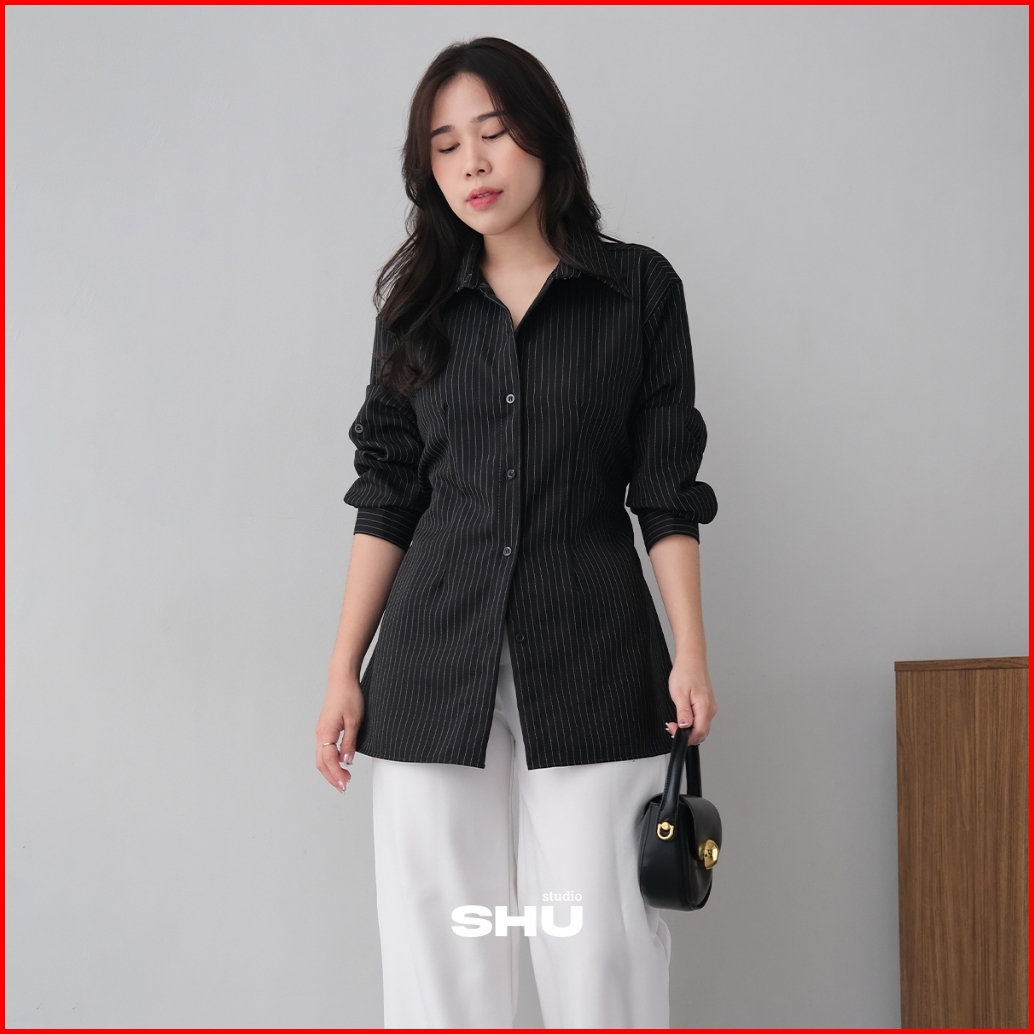 Shustudio - Kena Fitted Top Atasan Wanita Fit Body Kemeja Salur Slimfit Lengan Panjang