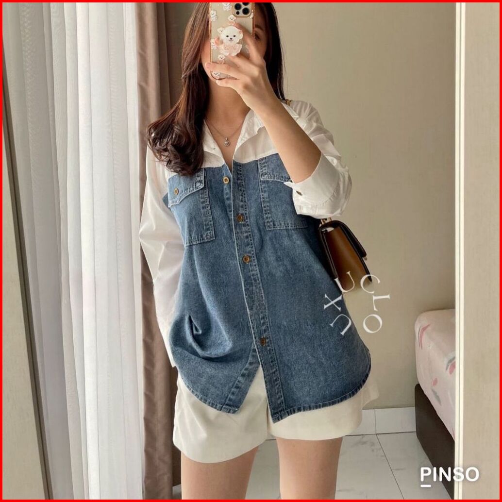 Uxuclo Denim Shirt Kemeja Wanita Denim Kombinasi Katun Poplin Kemeja Atasan Denim Wanita