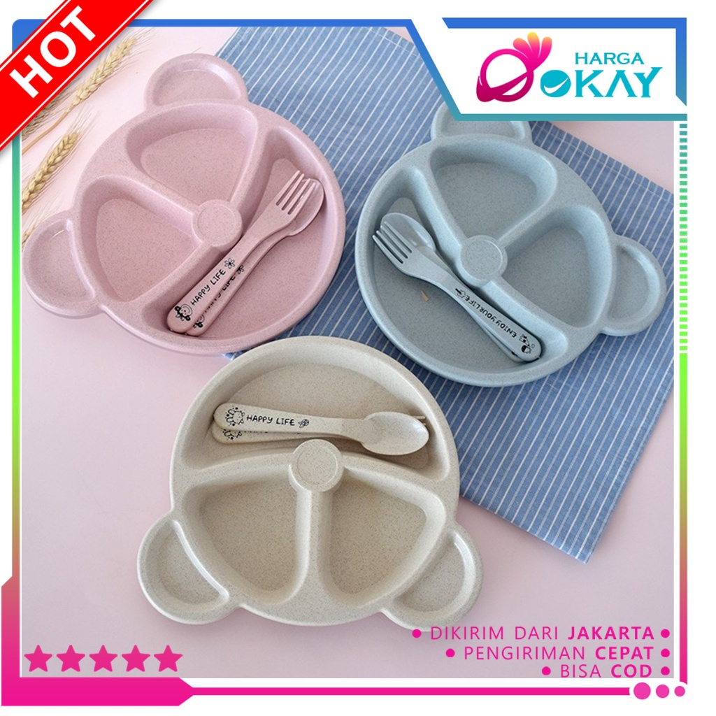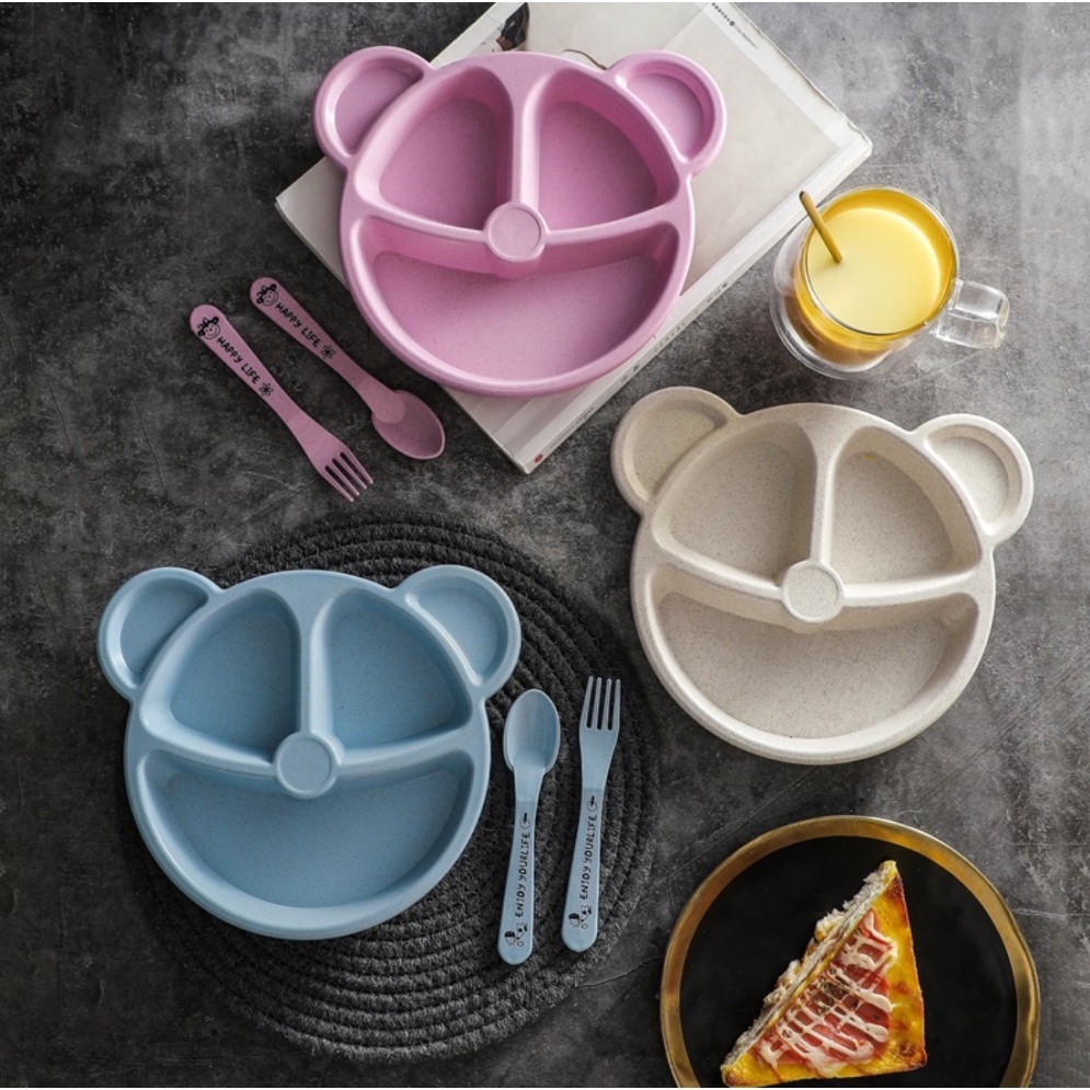 HO Feeding Set Cartoon Tableware Piring Garpu Sendok Lucu Murah Peralatan Makan Anak Set 3-Piece Bentuk Bear Tempat Makan Bayi Bahan Jerami Baby