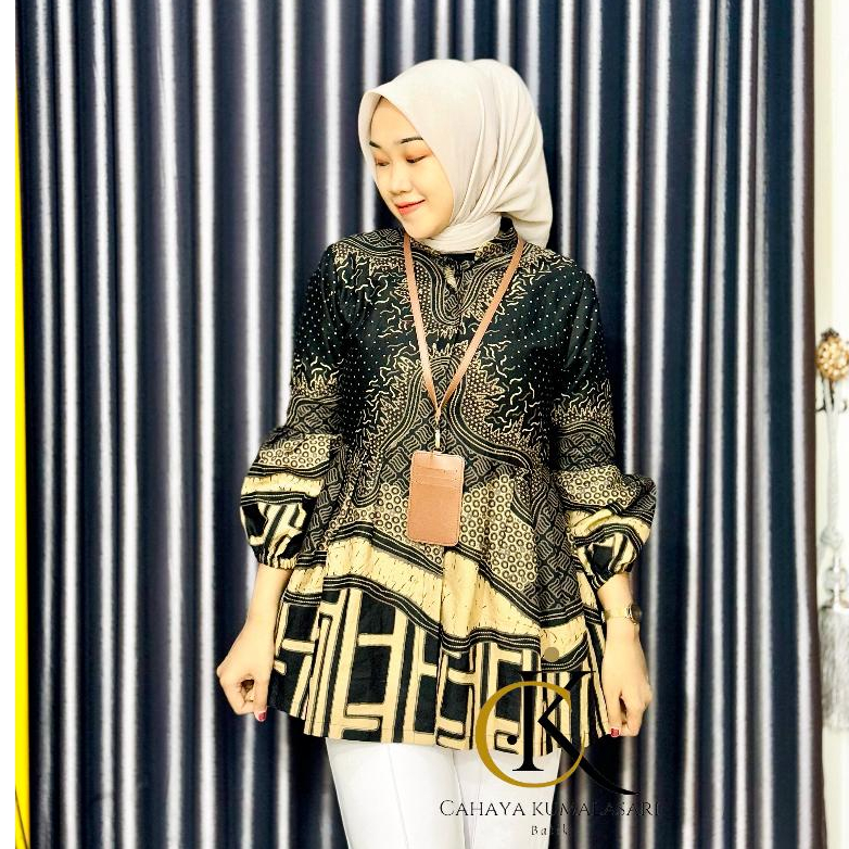 Blouse Batik Wanita Lengan Balon NAFIRA HITAM - Bahan Katun Prima Premium Batik Kerja Wanita Modern
