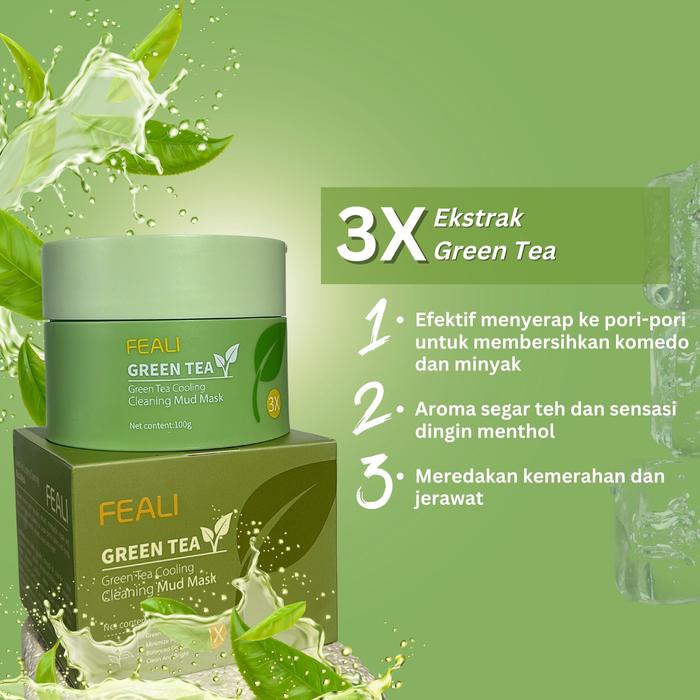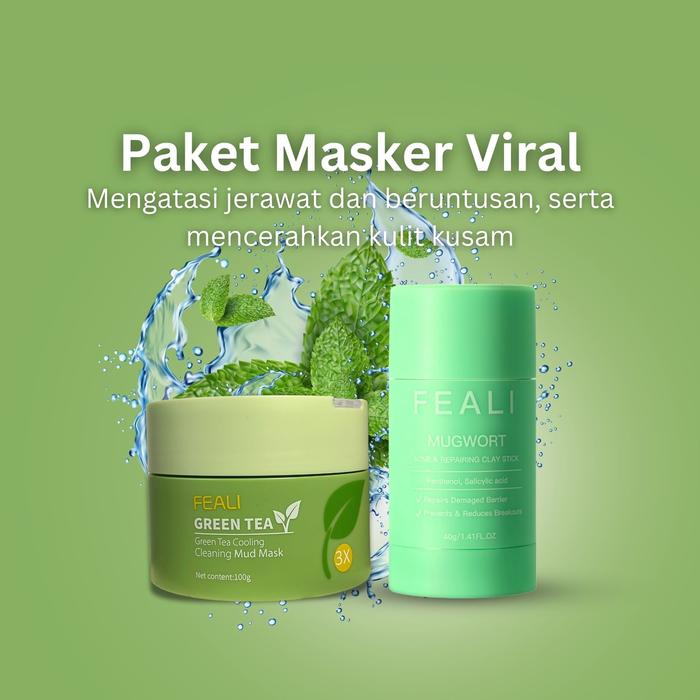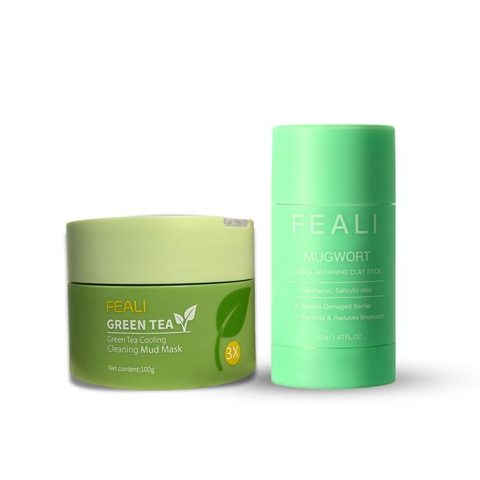 BUNDLE HEMAT - FEALI Green Tea Clay Masker Wajah 100gr + Mugwort Clay Stick Acne 40gr Hijau Komedo