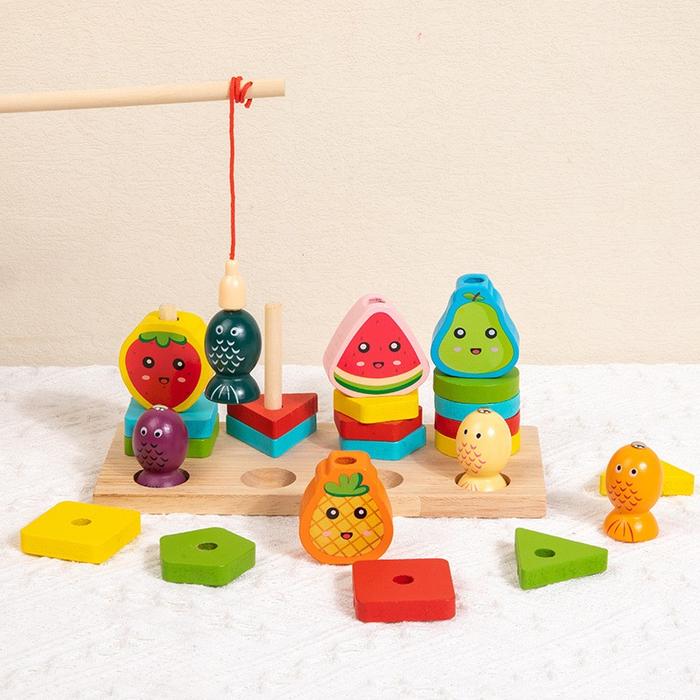 Mainan Edukasi Puzzle Kayu Multifungsi Geometri Tower 4 in 1 Meronce dan Pancing Untuk Anak