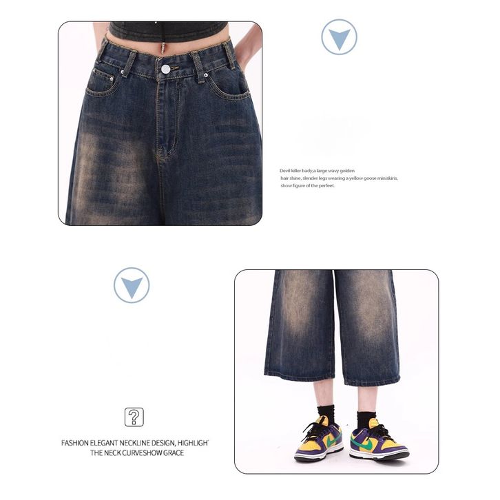Keygirl Celana Pendek Denim Biru Retro untuk dan Wanita Celana Crop Kaki Lebar Lurus Longgar high waist wide leg denim