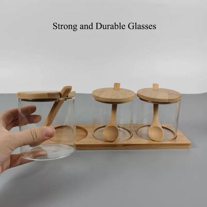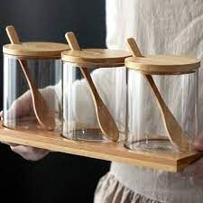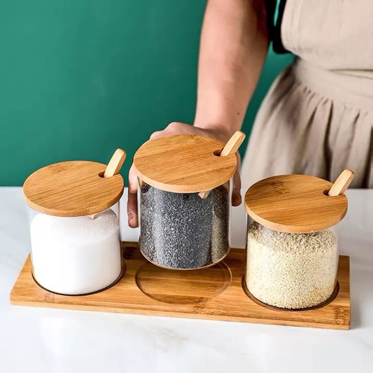 Toples Bumbu Dapur Wadah Bumbu Tempat Bumbu Botol Bumbu Gaya Jepang Kaca Bambu 3 Pcs