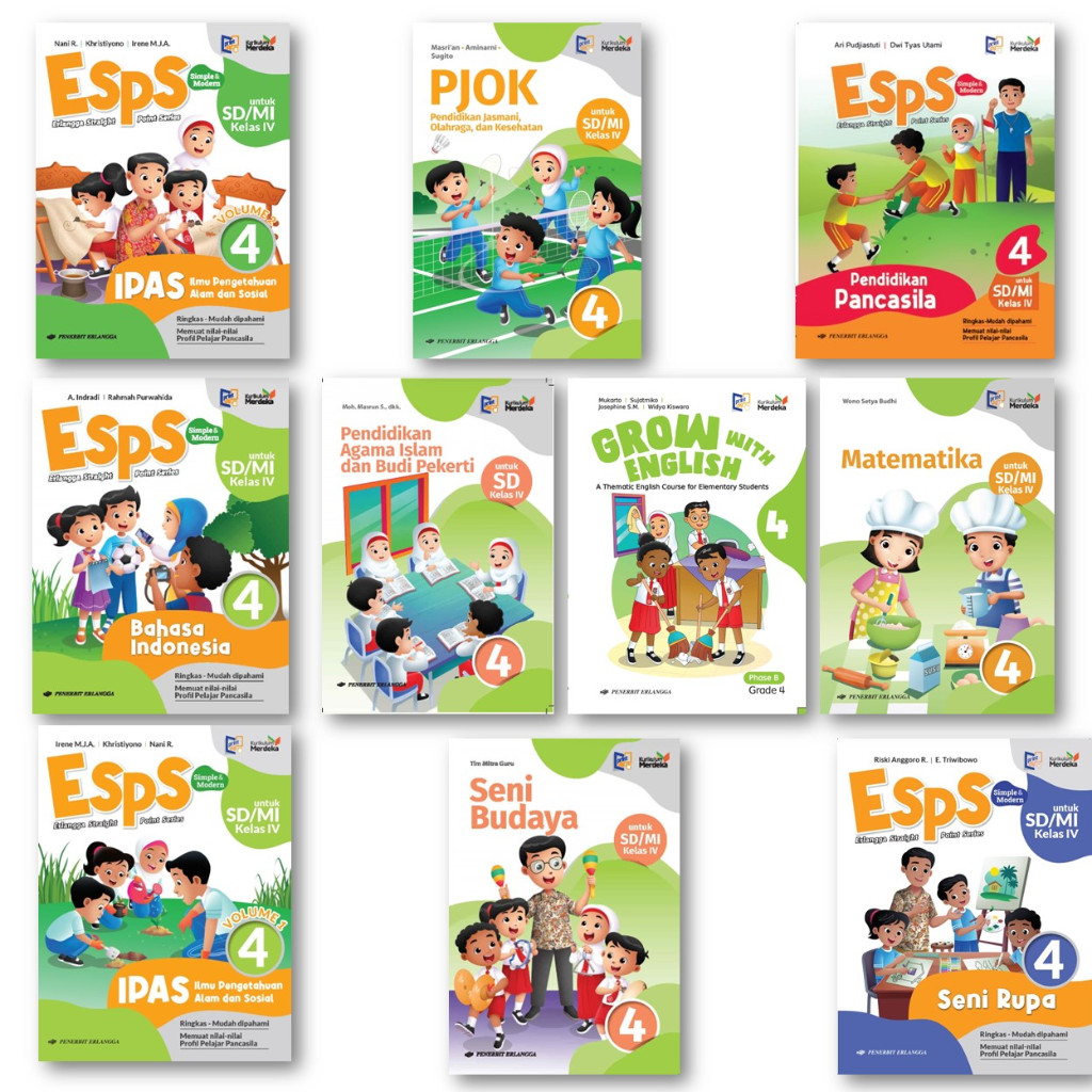SENI BUDAYA SD KLS 4, ESPS B INDO SD KLS 4, PJOK SD KELAS 4, ESPS IPAS SD 4 VOL 2, PAI SD KELAS 4, ESPS PANCASILA SD 4, GROW WITH SD KLS 4, ESPS MTK SD KLS 4, ESPS IPAS SD 4 VOL 1