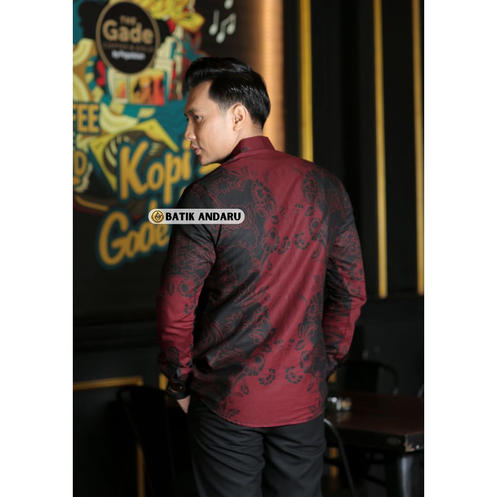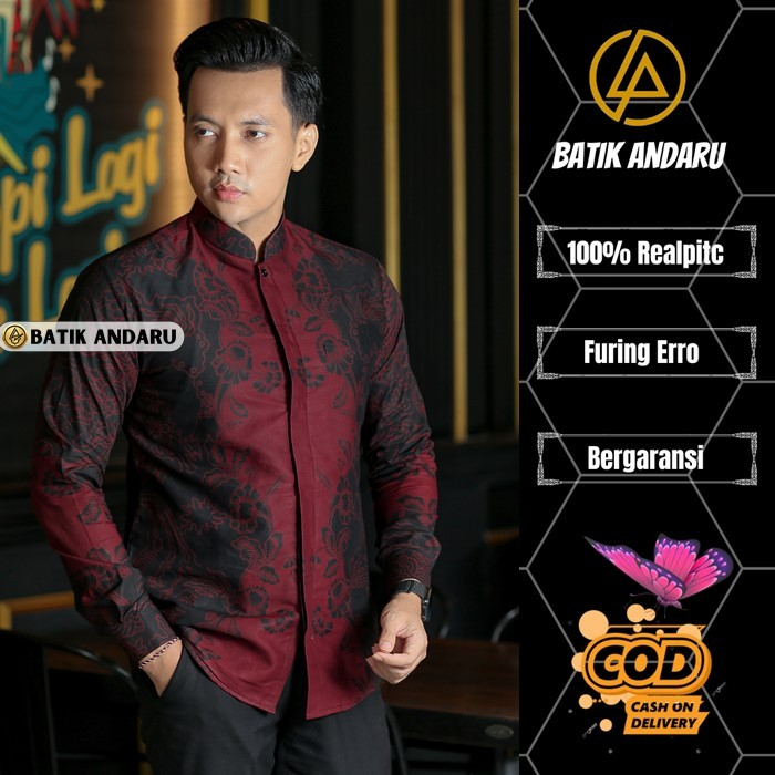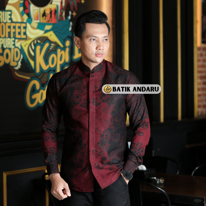 Batik Andaru Motif Koko Hawari Koko Batik Pria Lengan Panjang Kerah Shanghai Warna Hitam Maroon Full Furing Ero Premium