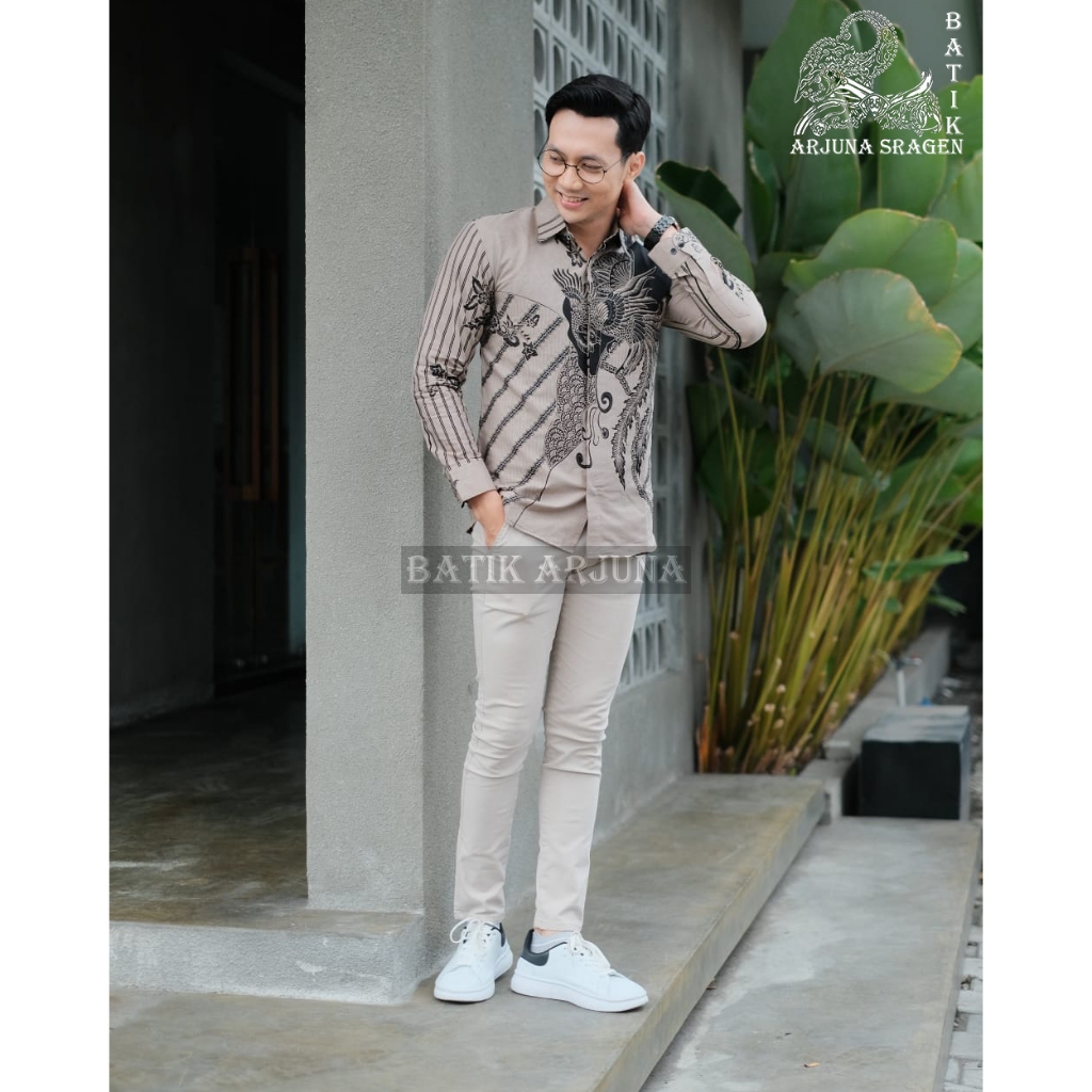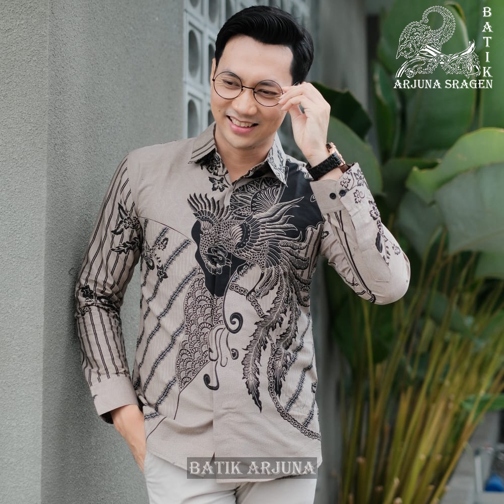 kemeja batik pria baju atasan lengan panjang modern slim fit kasual dan kerja cowok hem coklat