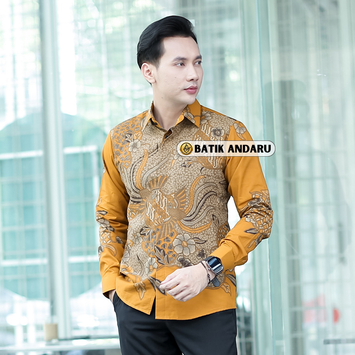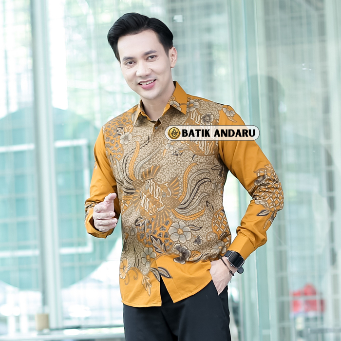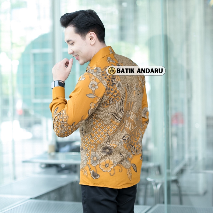 Batik Andaru Motif Cakrawangsa Baju Kemeja Batik Pria Cowok Slim Fit Lengan Panjang Modern Elegant Heem Katun Primisima Premium Warna Kuning