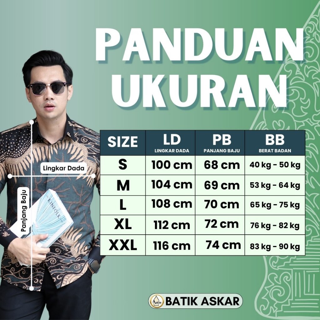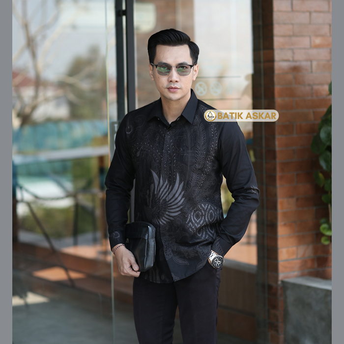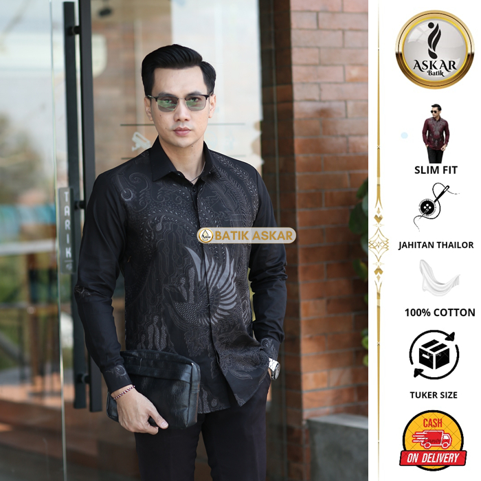Askar Batik Motif Dewandaru Baju Kemeja Batik Pria Slim Fit Lengan Panjang Bahan Katun Lasem Premium Heem Warna Hitam