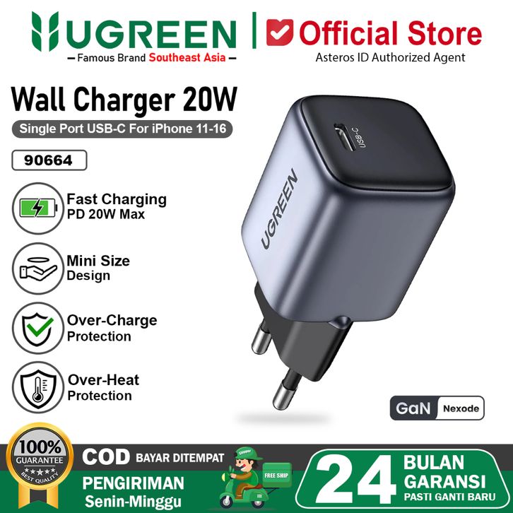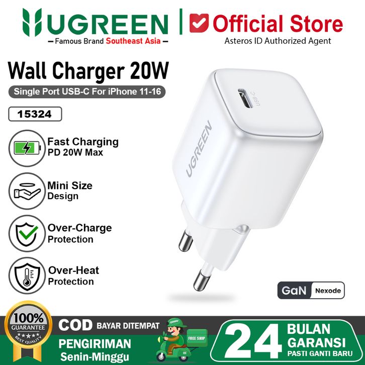 Adaptor UGREEN Adaptor Kepala Charger iPhone 16 15 14 13 12 11 Type C PD Fast Charging 20W 30W