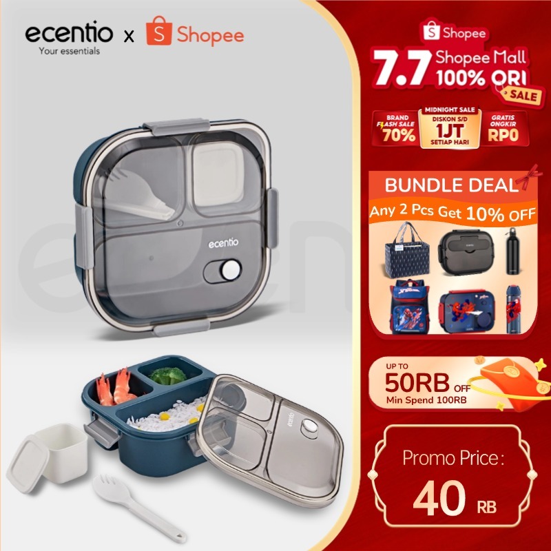 ECENTIO KOTAK BEKAL ANTI TUMPAH TUMPAH 3 GRID 1100ML KOTAK MAKAN WADAH BEKAL ANTI TUMPAH KOTAK SUP 100ML FREE SENDOK
