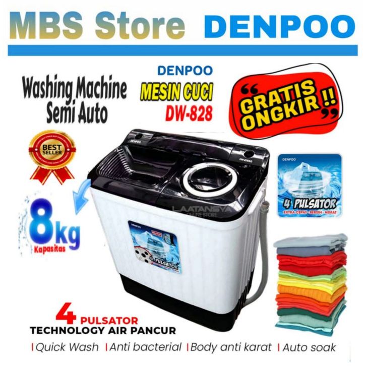 PROMO MESIN CUCI DENPOO 2 TABUNG TEKNOLOGI PAPAN PENGILAS DOUBLE PULSATOR 8KG DW 828 HITAM ORIGINAL
