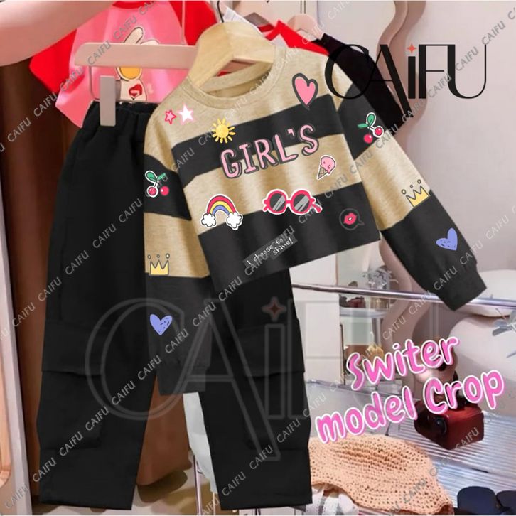 SETELAN ANAK PEREMPUAN MULTICLOUR GIRLS KIYOWO SWEATER STRIPE CROP + JOGGER JOOY WANITA STYLE KOREA SETELAN ANAK ANAK 2-