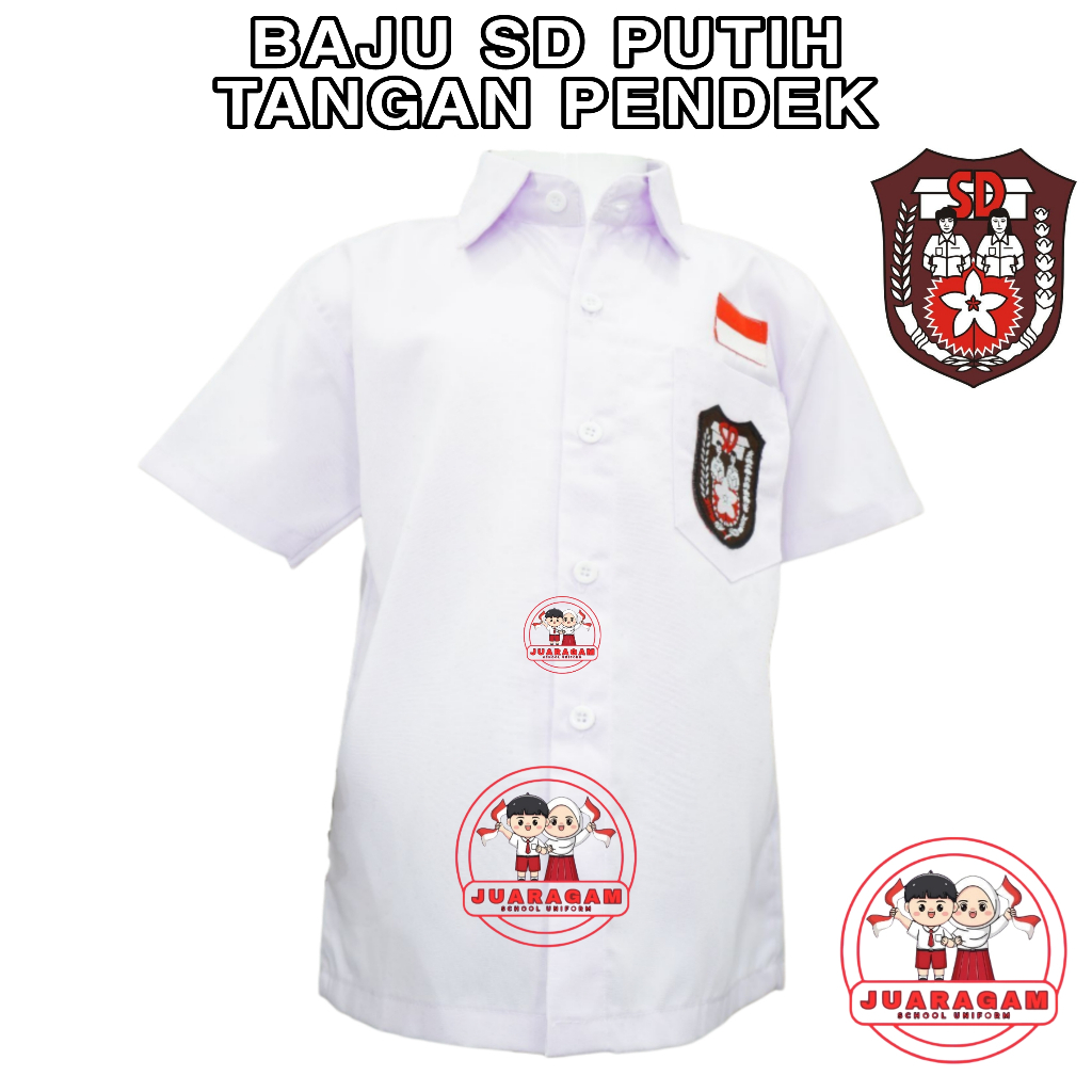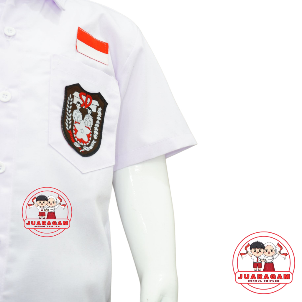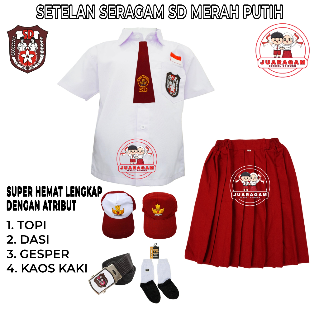 JUARAGAM Setelan Super Lengkap Seragam Sekolah SD Merah Putih Perempuan Baju Pendek Rok Pendek Kelas 1-6 SD