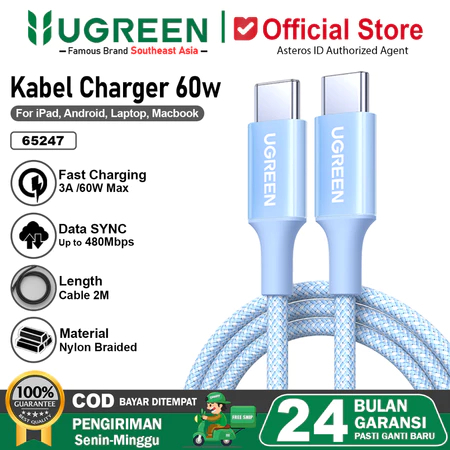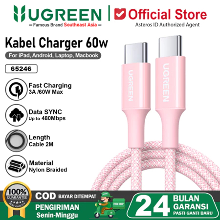 UGREEN KABEL PD TYPE C TO TYPE C NYLON BRAIDED FAST CHARGING MAX 3A 60W KABEL DATA MURAH TANPA DP ORIGINAL