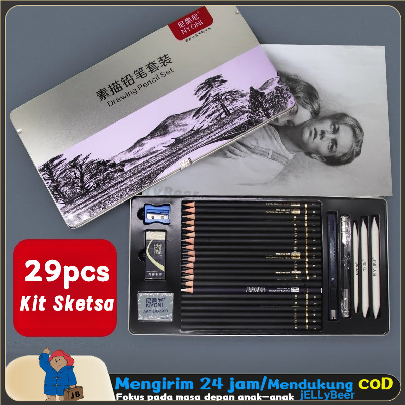 29 Pcs Profesional Pensil Sketsa Set Metal Tin Box Pensil Gambar Lukis Sketsa Lengkap Paket Arang Lembut