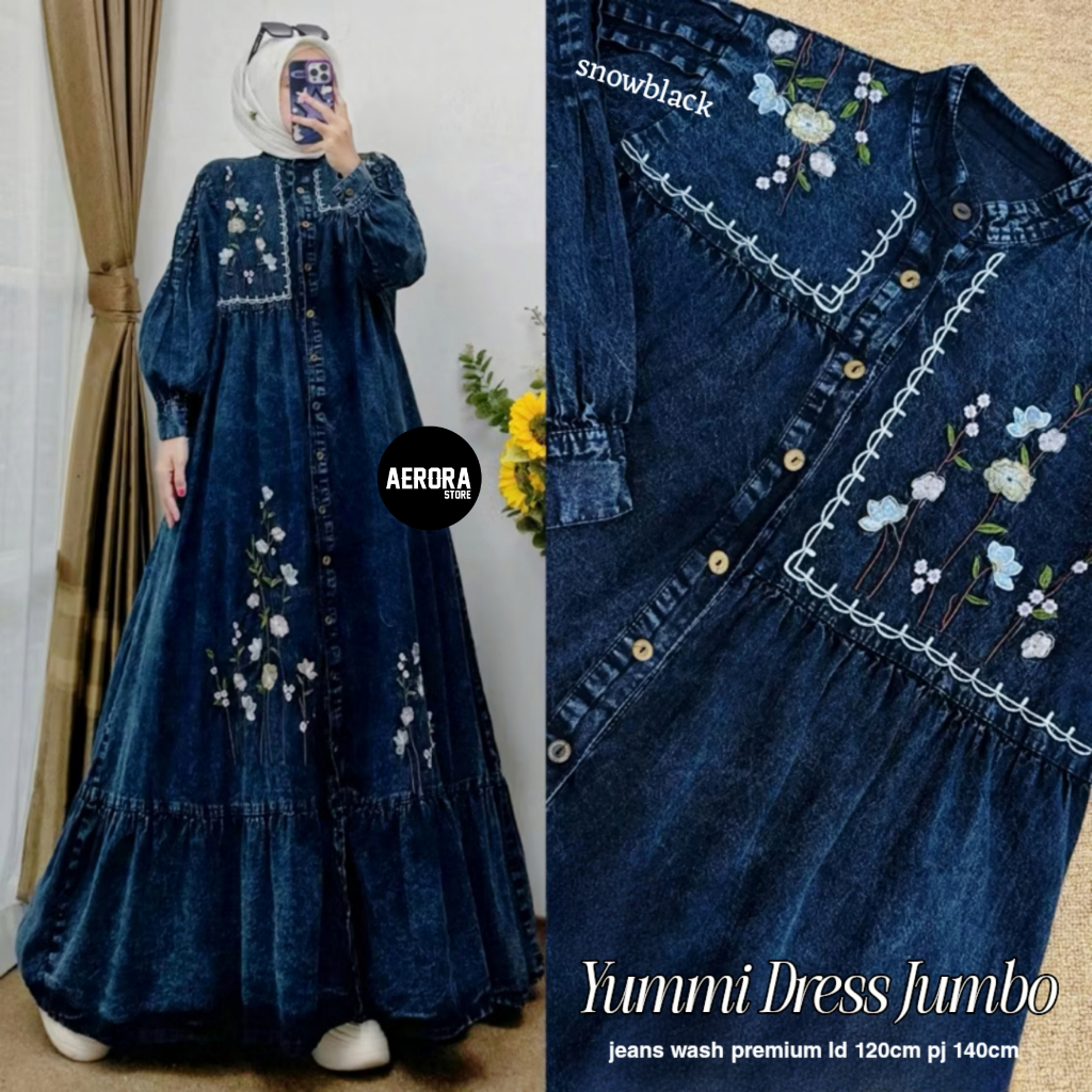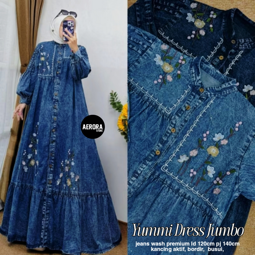 Aerora Baju Gamis Dewasa Jeans Jumbo Wanita Terbaru 2025 Dress Modern Busui Bordir Rampel Yummi