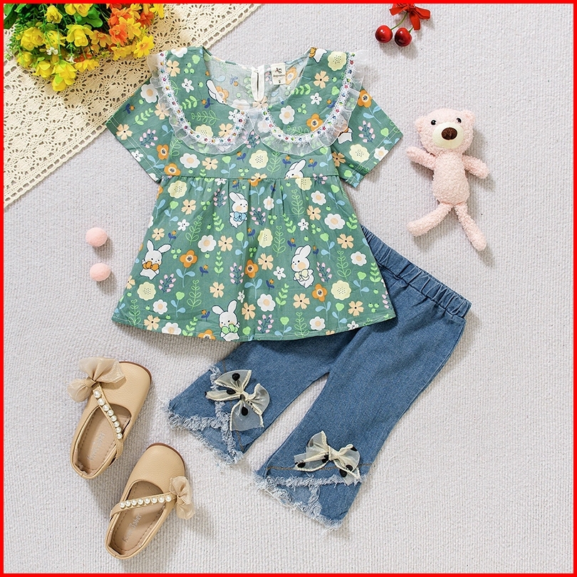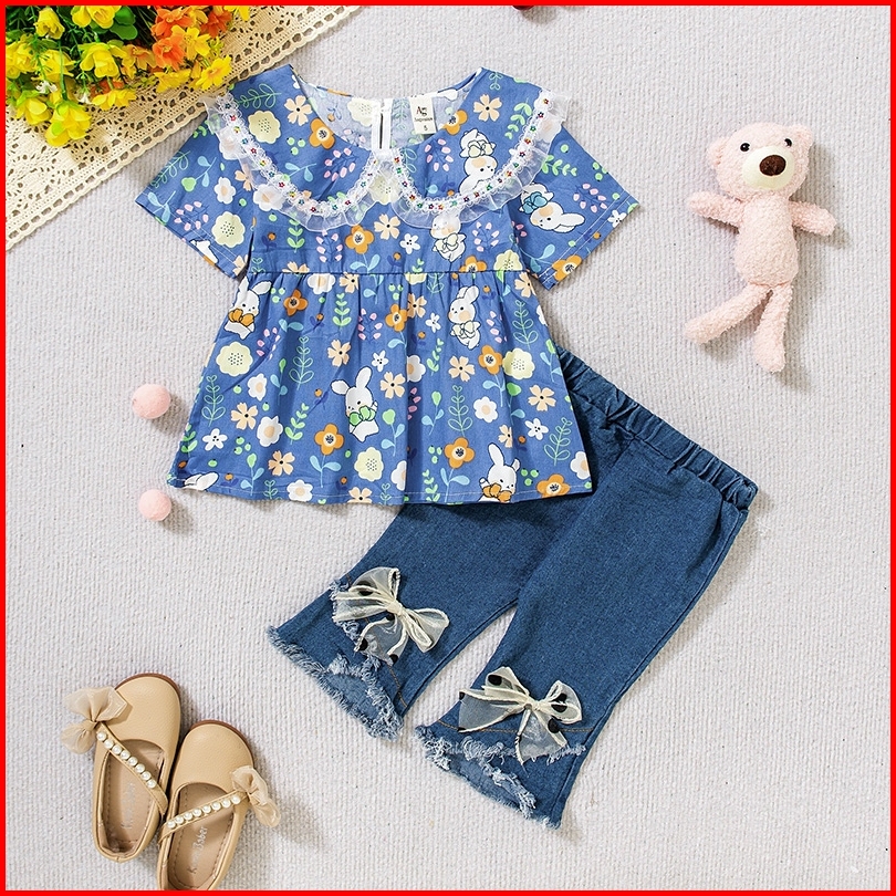 Twinkle Setelan Baju Anak Perempuan Motif Rabbit Flower Dengan Celana Jeans Casual - Usia 1-4 Tahun