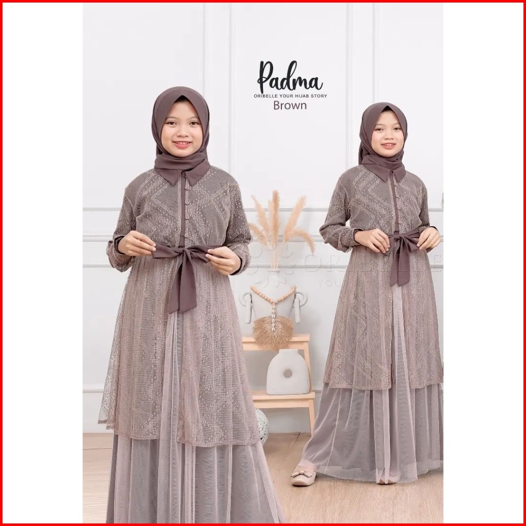 Gamis Muslim Anak Perempuan Usia 10-11-12-13-14-15 Tahun Padma Syari Kids Bahan Crinkle Airflow Mix Brukat