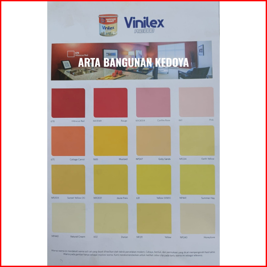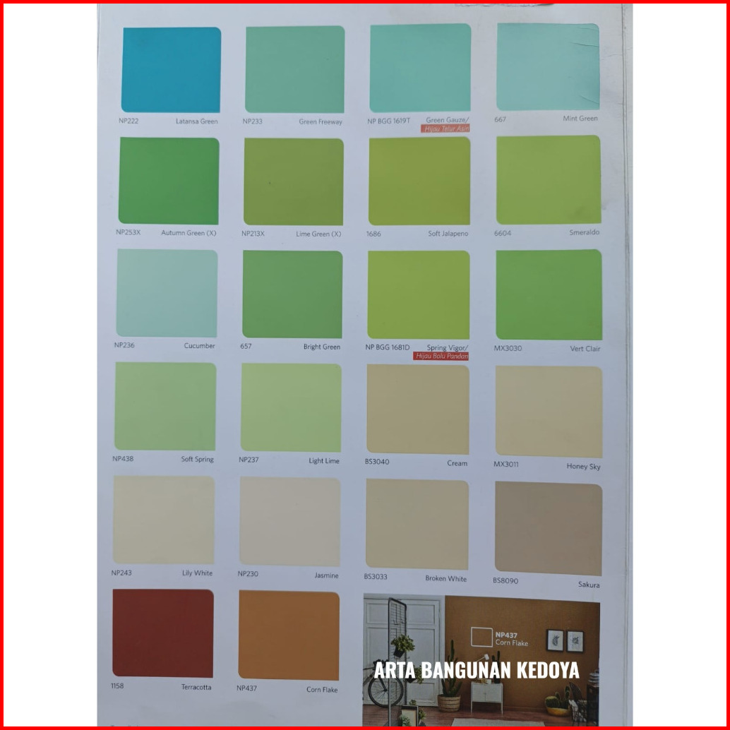 PUTIH SUPER KENTAL, 9102 White, SW Super White, 1001 Brilliant White, BS 9103 Black, 1158 Terracotta, 1685 Mustard, 1686 Soft Jalapeno, 602 Durian, 631 Yellow KMX, 657 Bright Green, 659 Misty Blue, 6604 Smeraldo, 661 Pink, 667 Mint Green, 675 Cottage Carrot, 678 Hibiscus Red, 686 Light Pewter, 687 Miner Gray, 755 Antique Grey, BGG1619T Green Gauze, BGG1681D SpringVigor, BS3033 Broken White, BS3040 Cream, BS8090 Sakura, K1157 M III Blue2000, K1179 Atlantic, K1671 Moon Glow, MX3004 Confire Rose, MX3011 Honey Sky, MX3015 Blue Reveur, MX3025 SWS, MX3030 Vert Clair, MX3031 Jaune Frais, MX3149 Rouge, MX3155 Dos Indigo, NP 200 Crystal Lime, NP 211 Yellow, NP 213X Lime Green, NP 218 Tropical Grey, NP 222 Latansa Green, NP 227 Charcoal, NP 230 Jasmine, NP 231 Harbor Blue, NP 233 Green Freeway, NP 234 Earth Yellow, NP 236 Cucumber, NP 237 Light Lime, NP 238 Lettuce, NP 240 Honey Tone, NP 243 Lily White, NP 245 Marina, NP 247 Goby Sands, NP 249 Sky Blue, NP 251X SunsetYellow, NP 253X Autumn Green, NP 254 Nice Purple, NP 273 Blue White, NP 437 Corn Flake, NP 438 Soft Spring, NP 439 Milk White, NP 440 Natural Cream, NP 441 Summer Hay, NP 442 Violetta