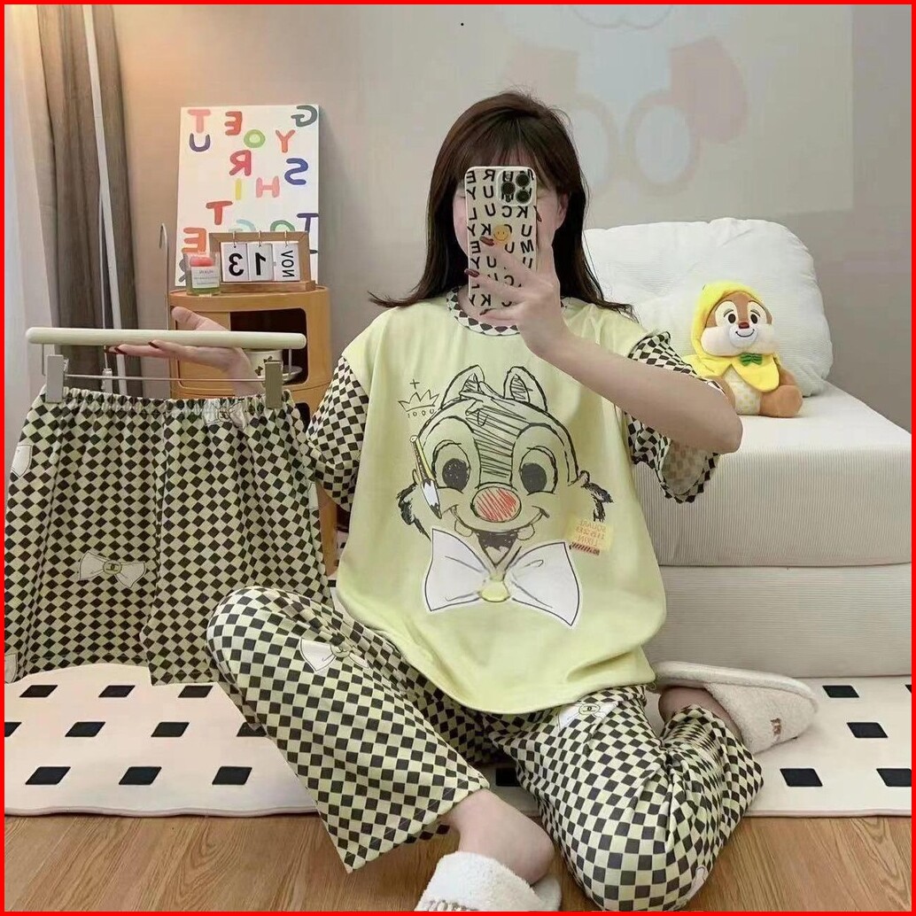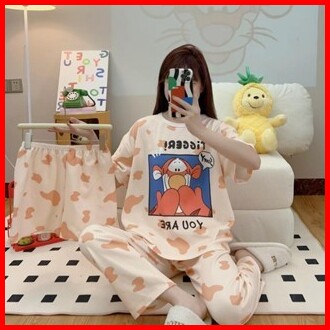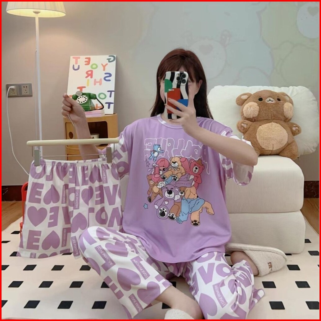 Jovan Setelan Wanita 3 In 1 Celana Panjang Celana Pendek Motif Print Baju Tidur Murah One Set Piyama