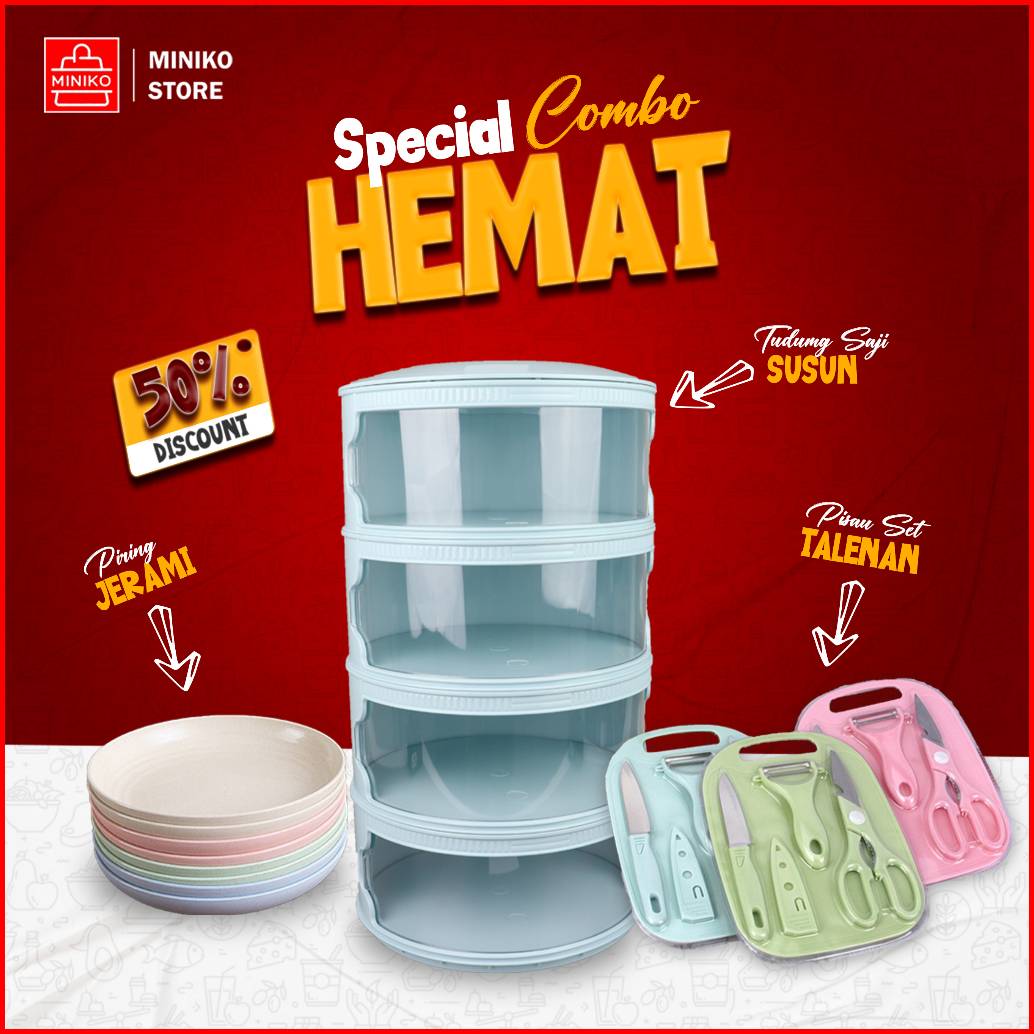 Paket Bundling 3pcs Tudung Saji 4 Susun Pisau 4in1 Piring Plastik Murah