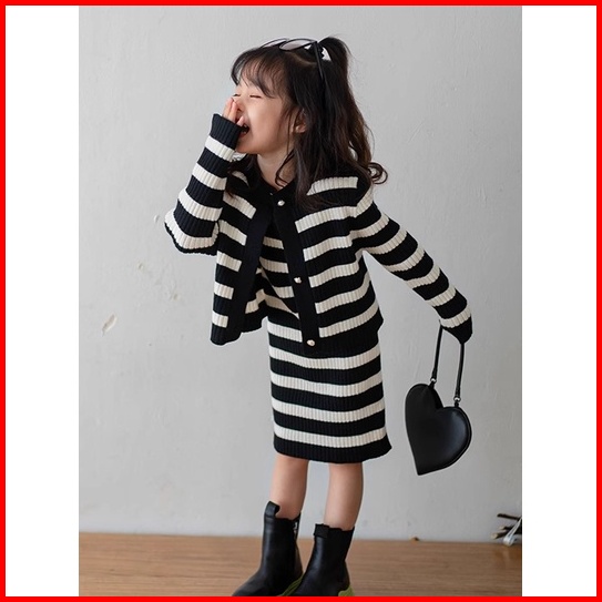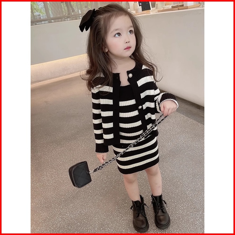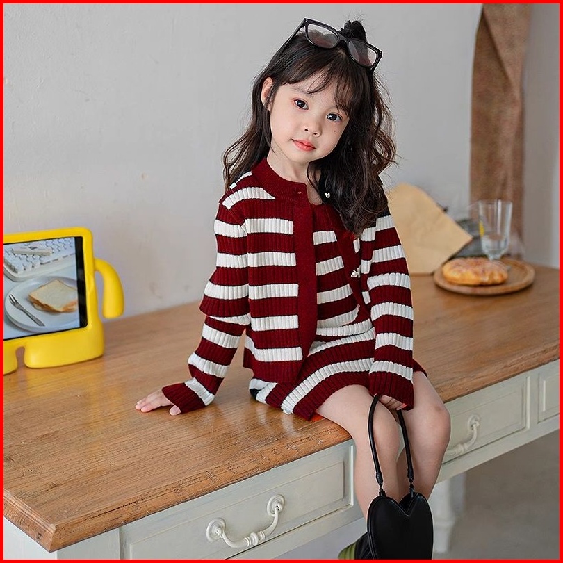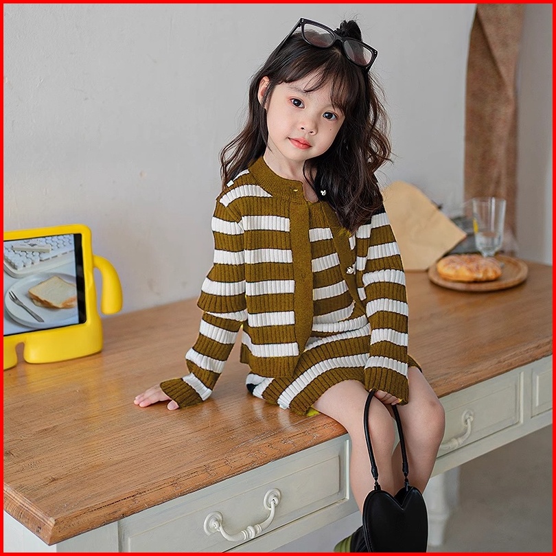 Cherystore88 Setelan Dress Anak Perempuan Namaki Salur Setelan Dress Cardigan 2 In 1 Anak Cewek Korean Style Usia 1-5 Ta
