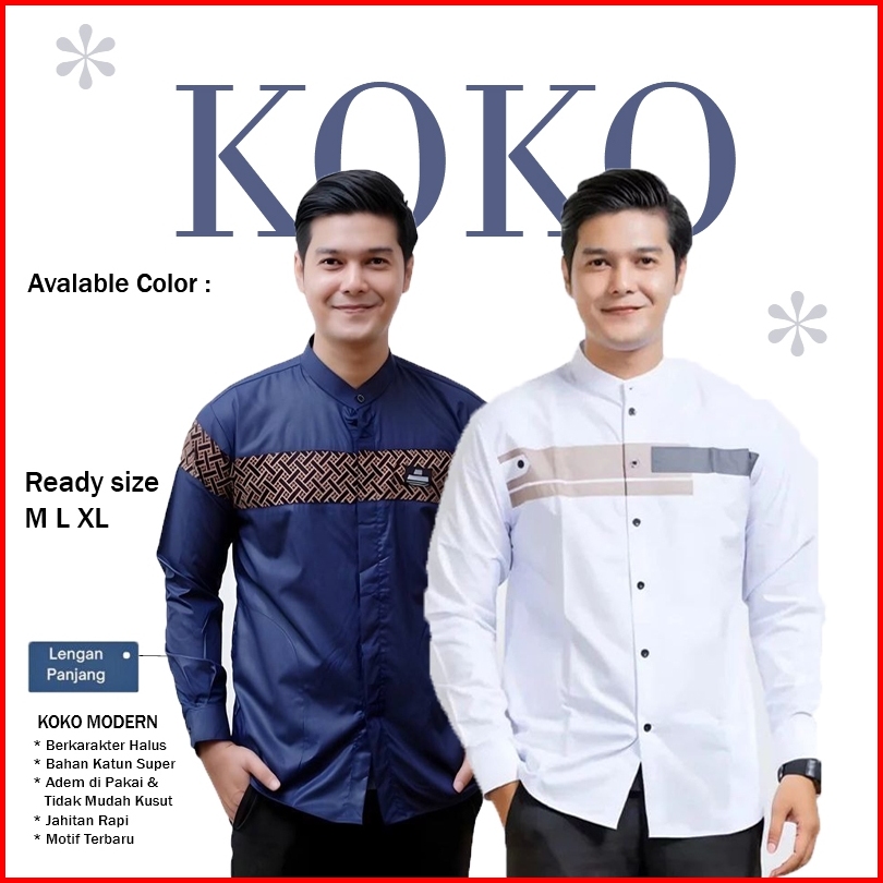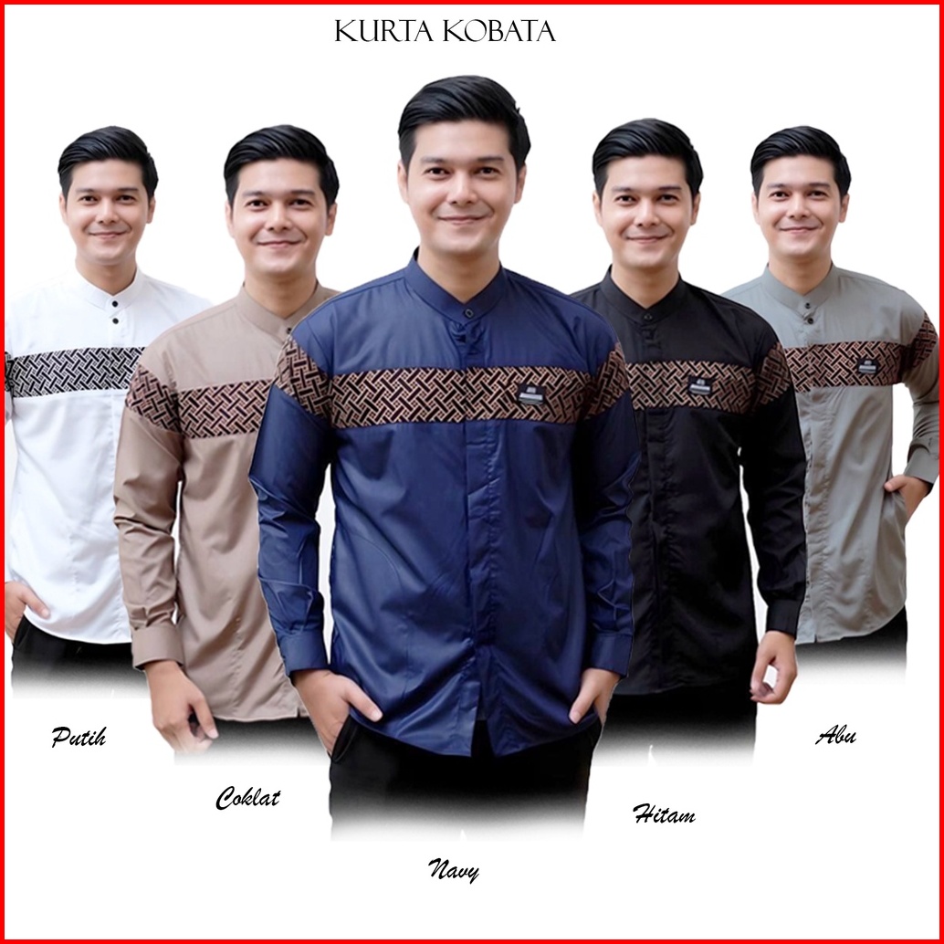 Baju Koko Pria Lengan Panjang Motif Kobata Kombinasi Warna Coklat Putih Hitam