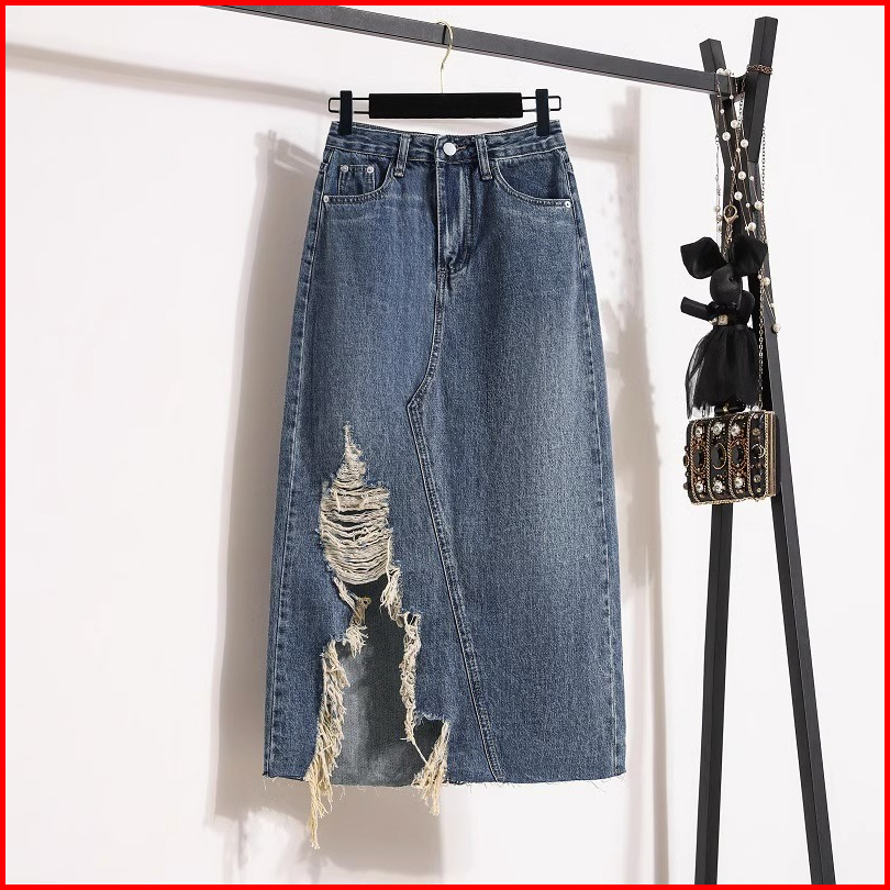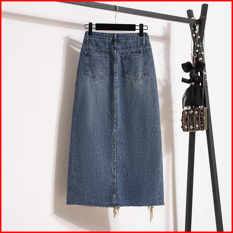 Tinggi Pinggang Slim Celah Retro Tepi Mentah Rok Denim Wanita