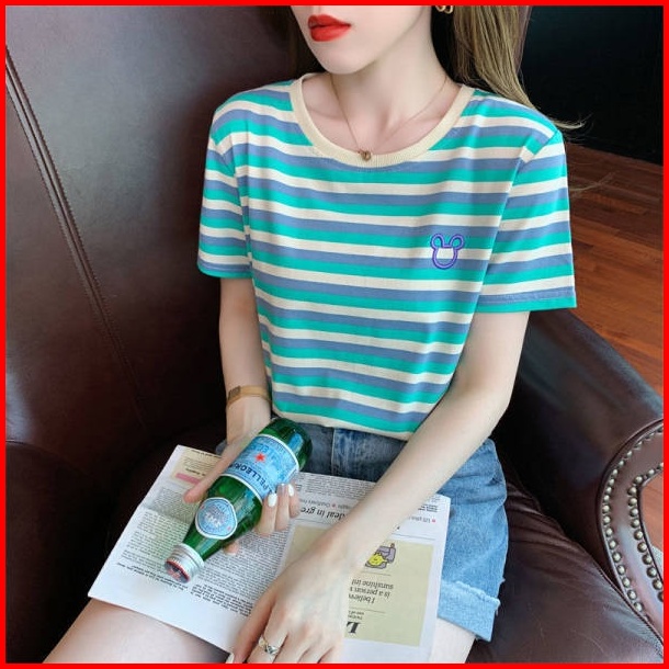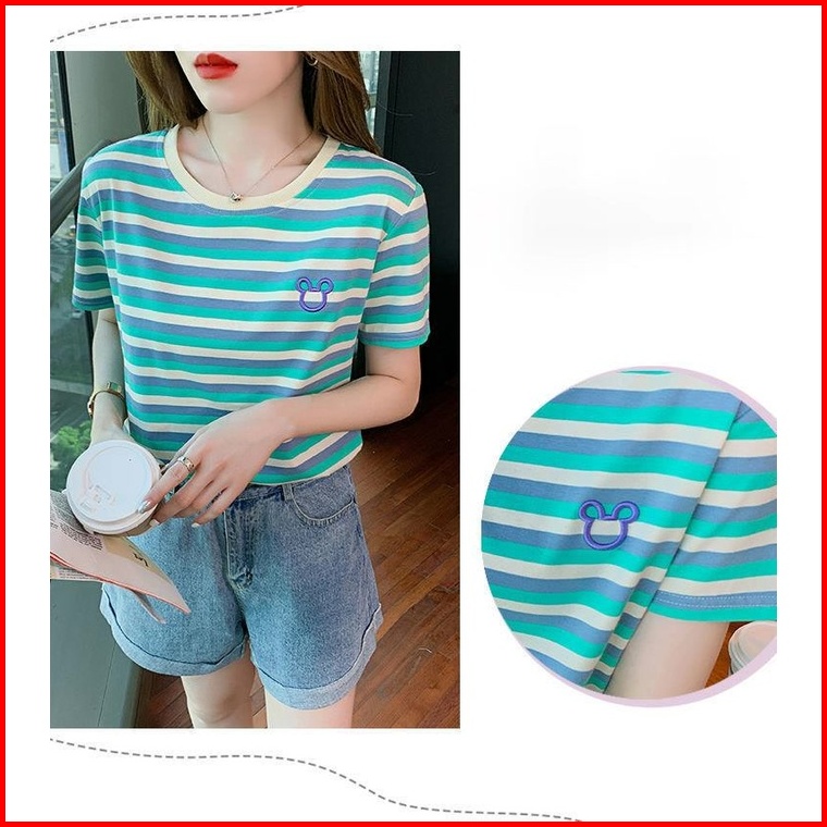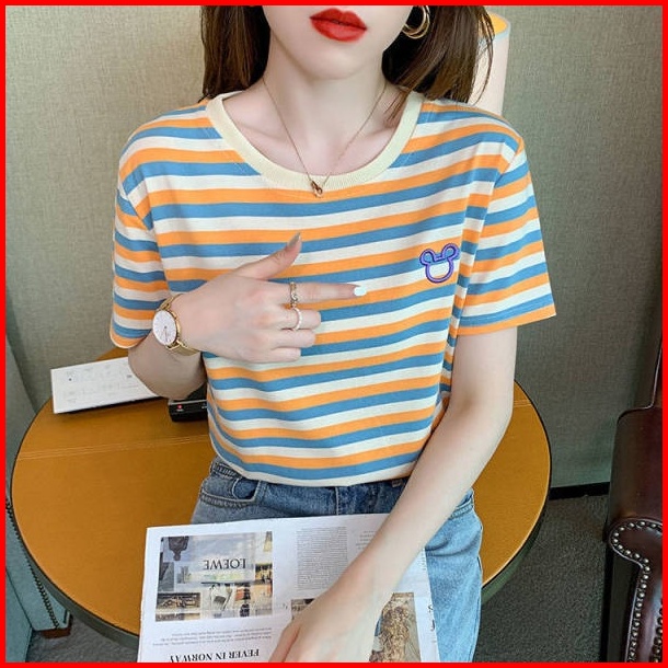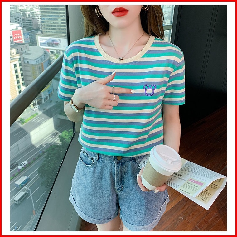 Kaos Wanita Lengan Pendek Leher Bulat Baru Musim Panas Atasan Bergaris Longgar Dan Serbaguna Gaya Korea Bordir
