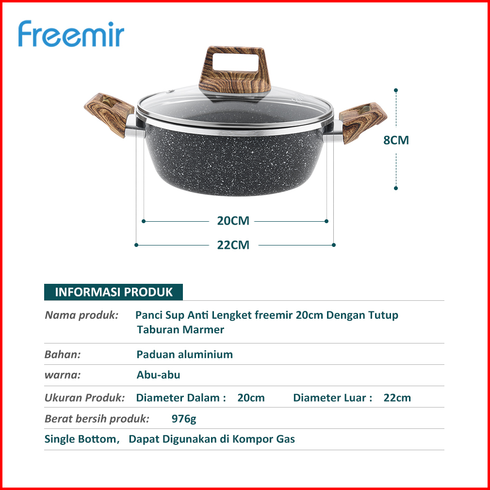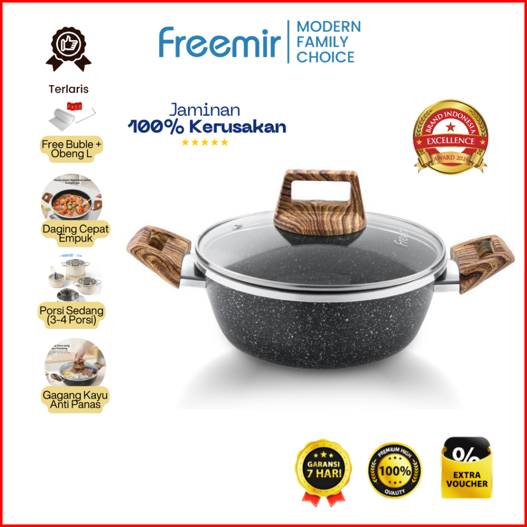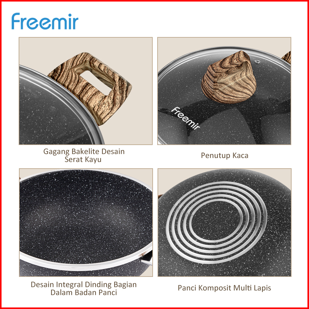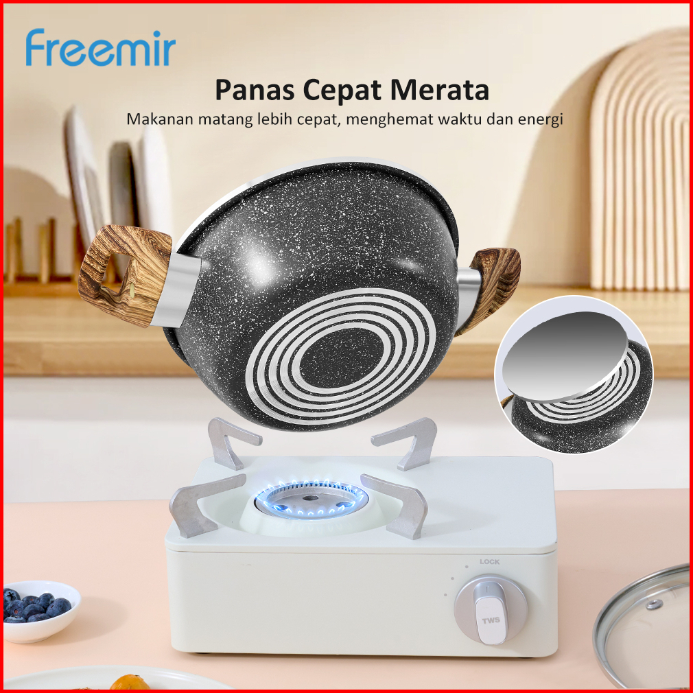 Original Freemir Wajan Panci 20 Cm Anti Lengket Lapisan Granit Woody Modern Tutup Kaca