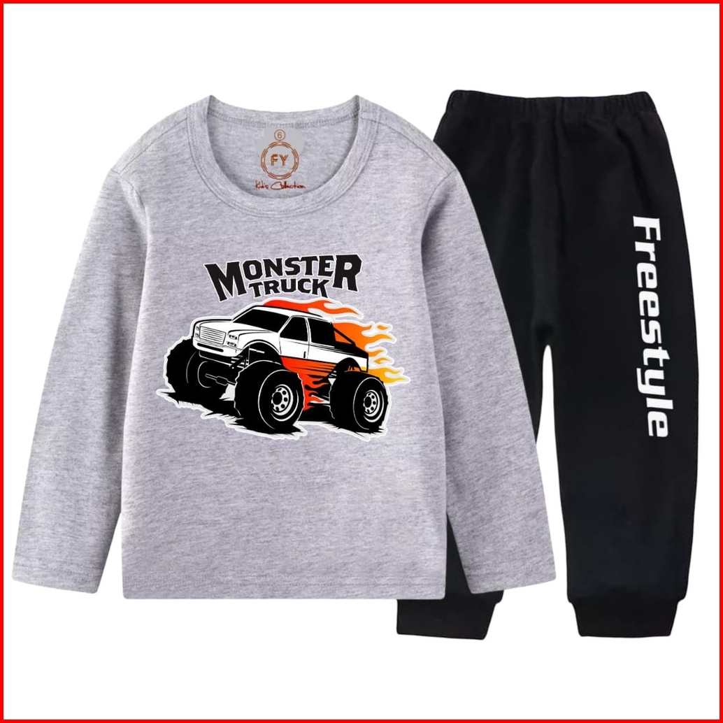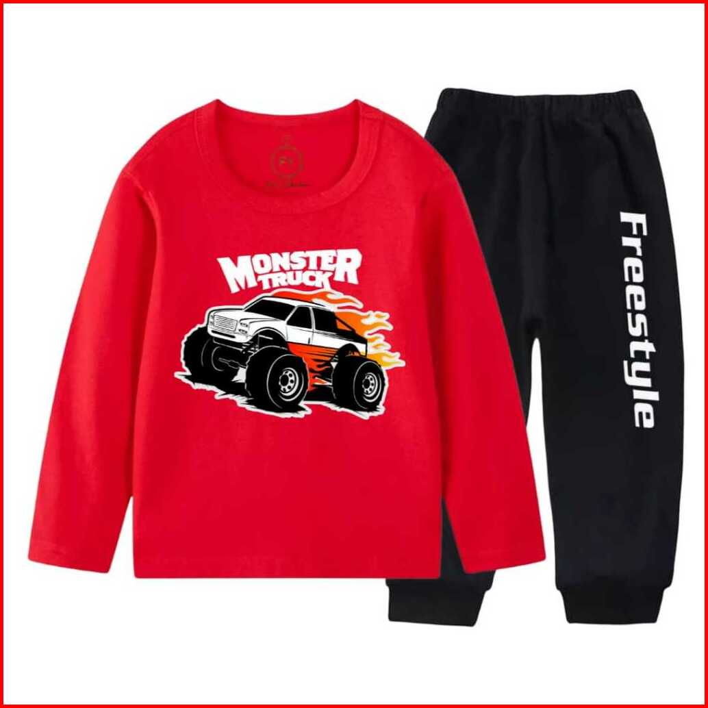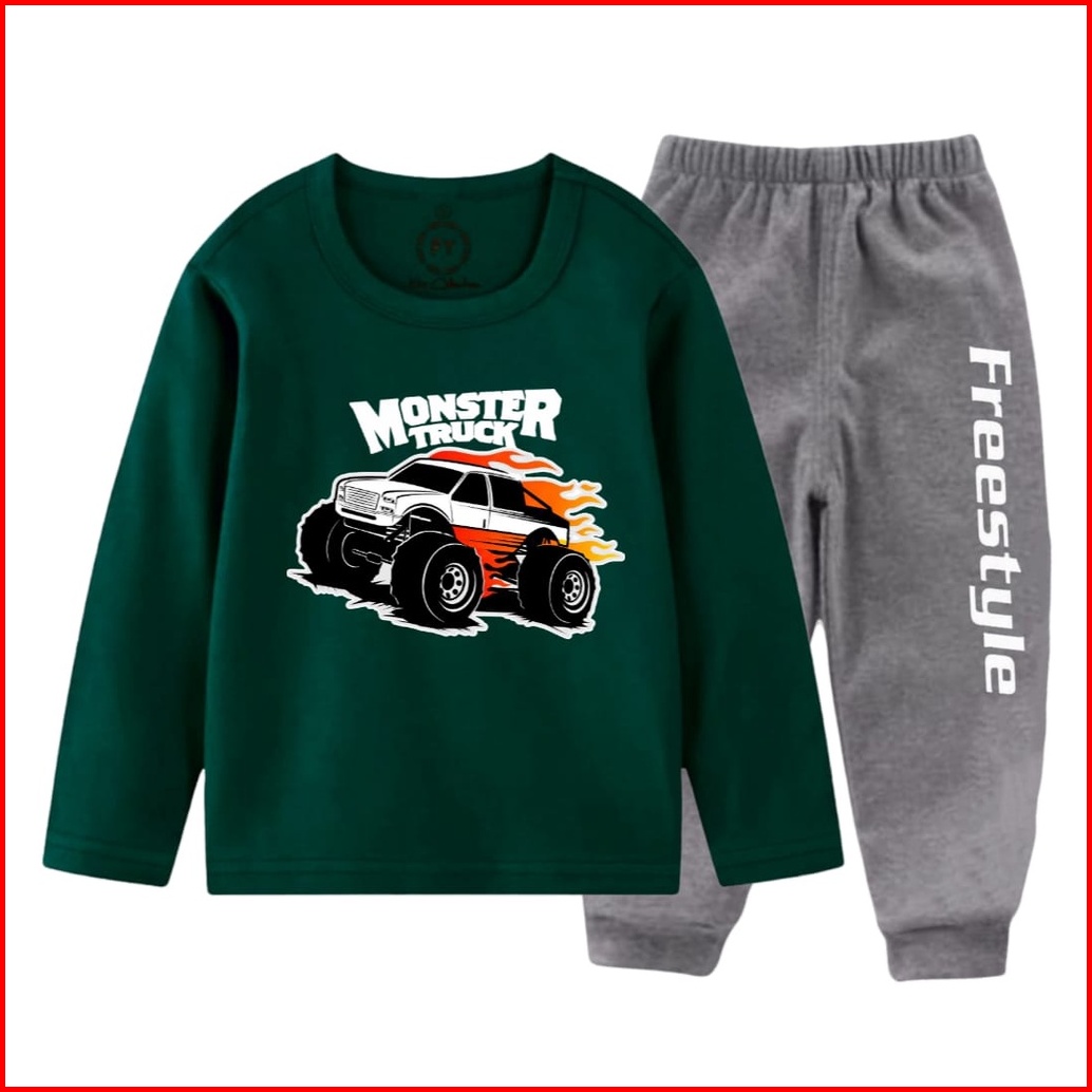 Set Panjang Anak Cowok Setelan Lengan Panjang Anak Laki Motif Monster Truck Dtf