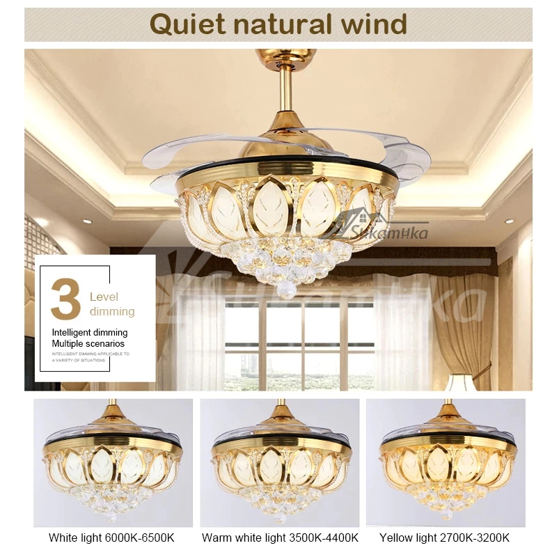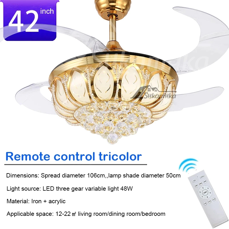 Lampu Kipas Angin Lampu Gantung Kristal Mewah LED 3 Warna Lotus Lampu Hias Ceiling Lamp Chandelier 48W Ruang Makan Ruang Tamu Kamar Tidur