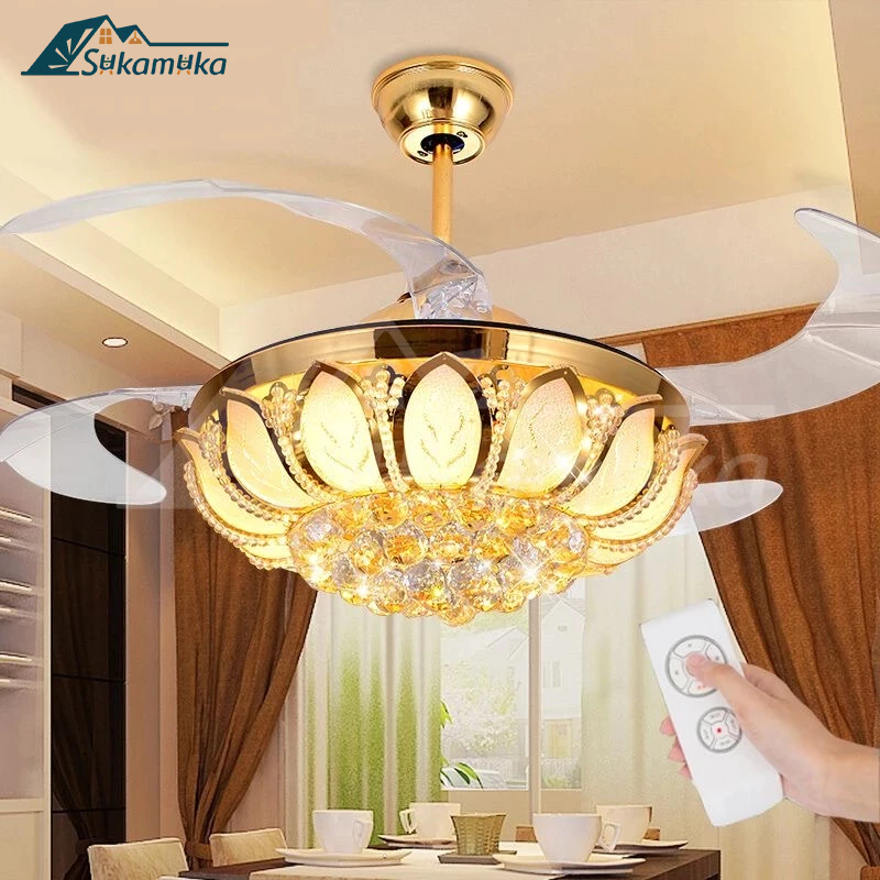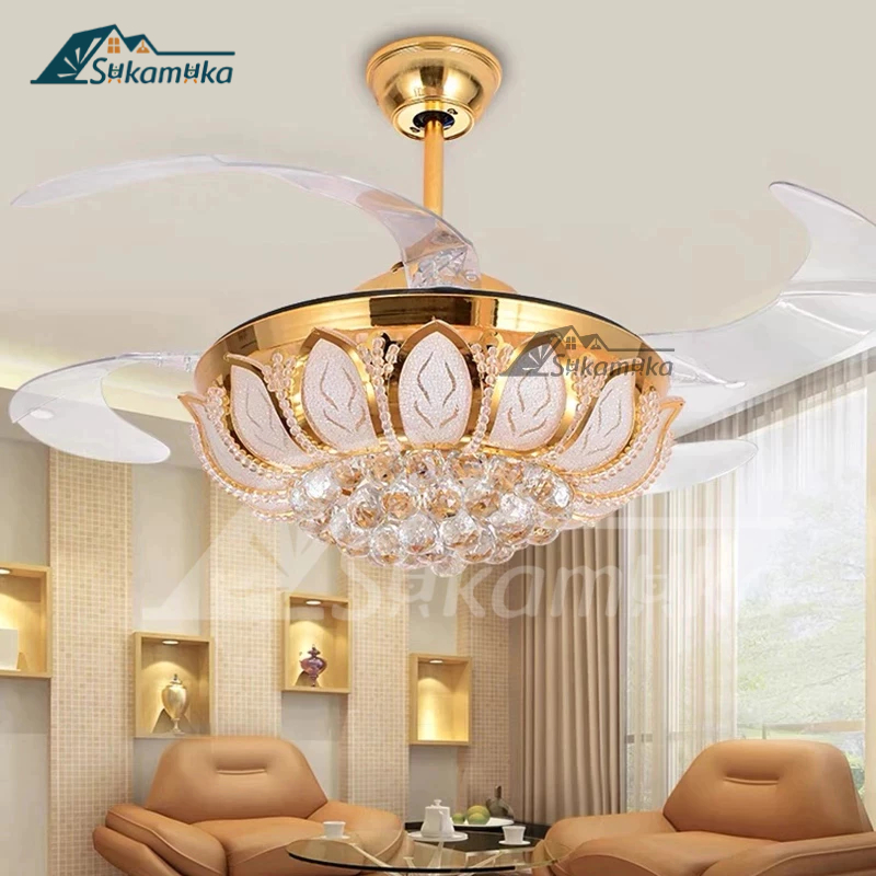 Lampu Kipas Angin Lampu Gantung Kristal Mewah LED 3 Warna Lotus Lampu Hias Ceiling Lamp Chandelier 48W Ruang Makan Ruang Tamu Kamar Tidur