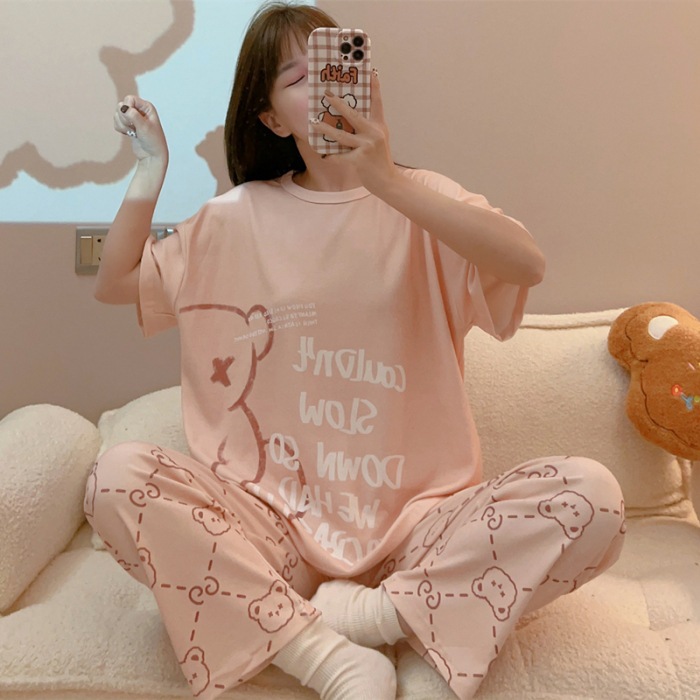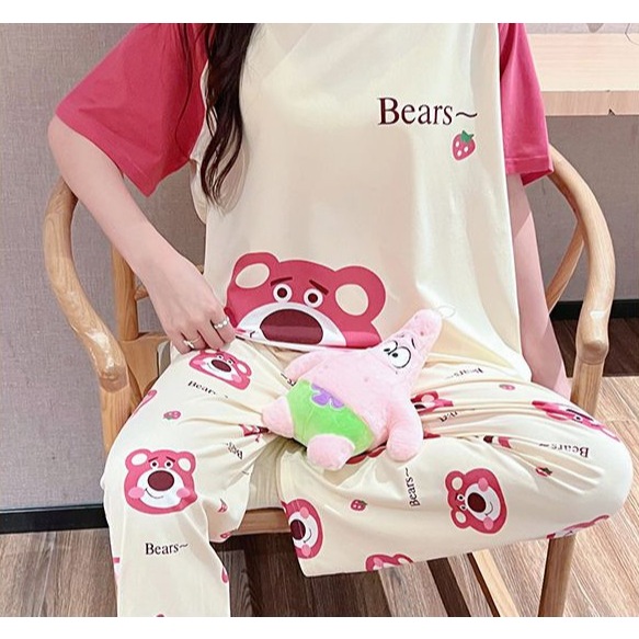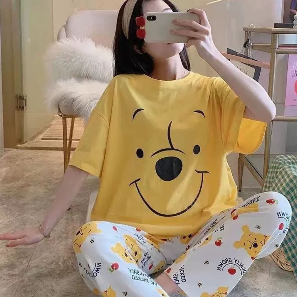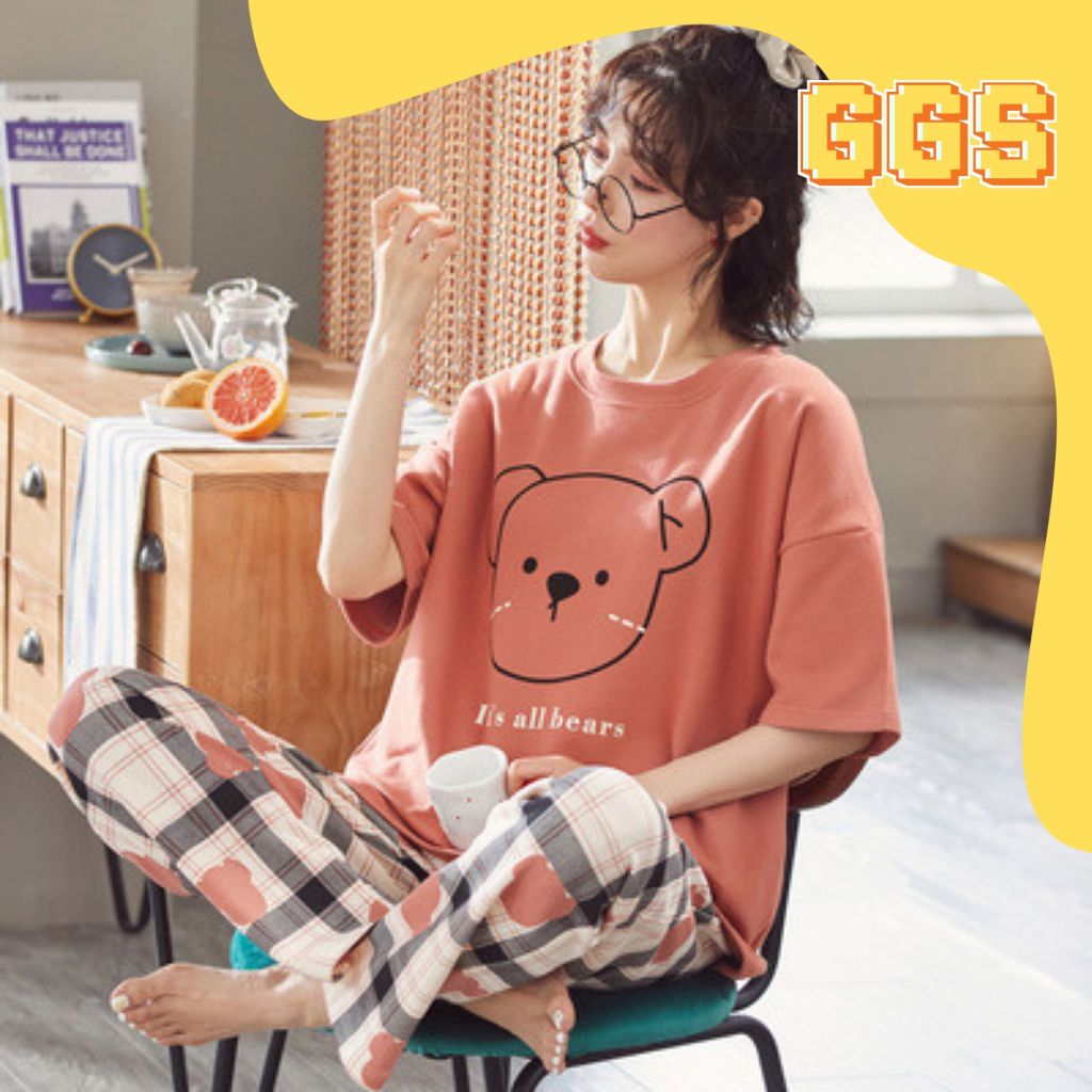 GGS Piyama Baju Tidur Wanita Remaja Dewasa Set Baju Lengan Pendek Celana Panjang Murah Setelan Kaos Motif Kartun Lucu PY