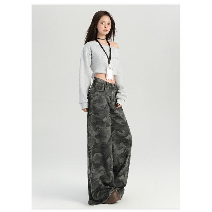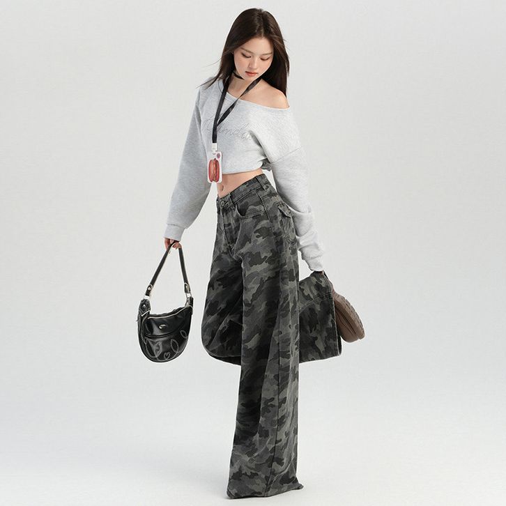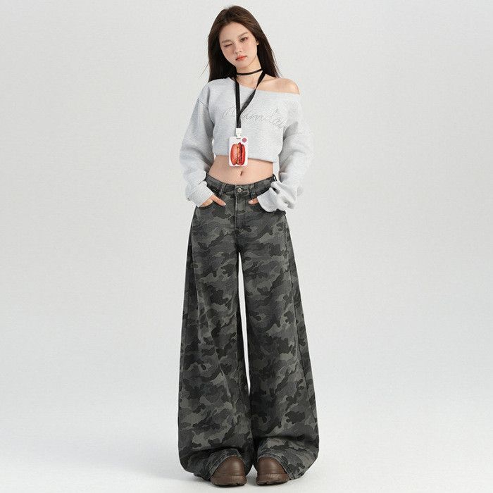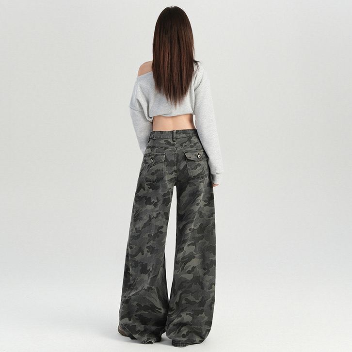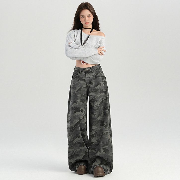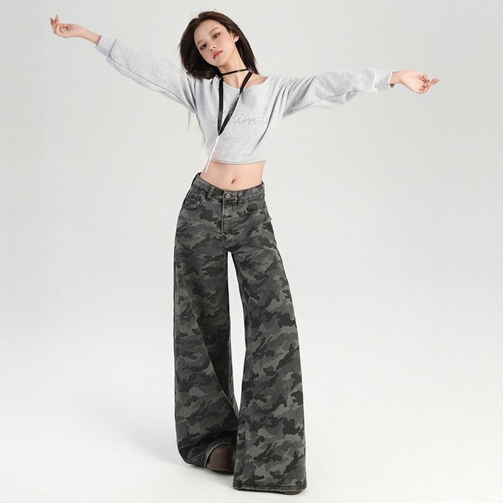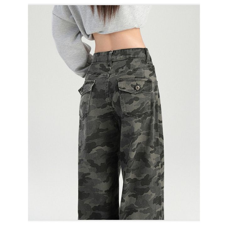 [Star] Celana Jeans Wanita Size S-6XL Cargo Highwaist Camouflage Loose Baggy Gaya Amerika Kekinian Wide Leg Import