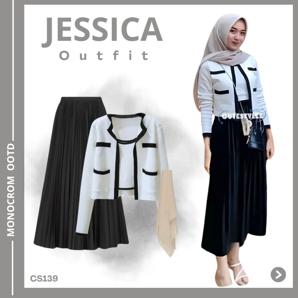 Oneset Rok Hijab 3in1 (Rok Plisket Premium, Cardigan Inner Rajut, Hijab ) Outfit OOTD Wanita CS139
