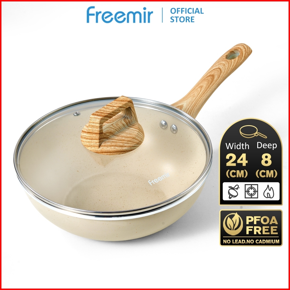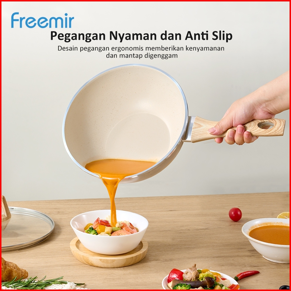Freemir Wajan Panci Beige 24cm Dengan Tutup Kaca Kedalaman 8 Cm Anti Lengket Gagang Kayu Sintetis