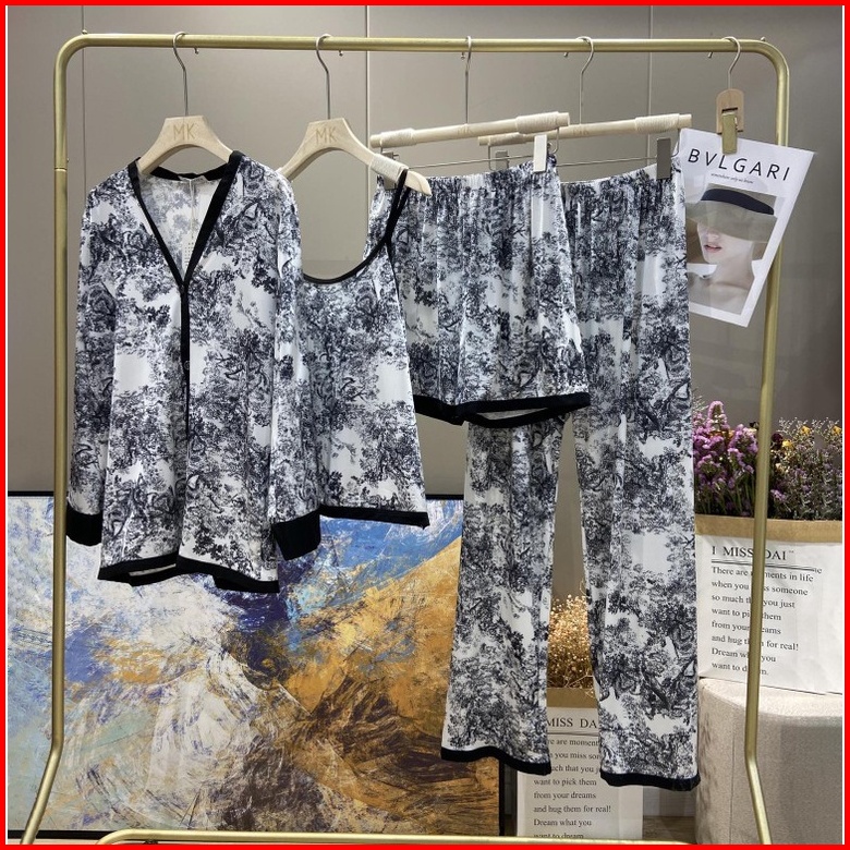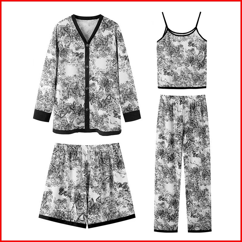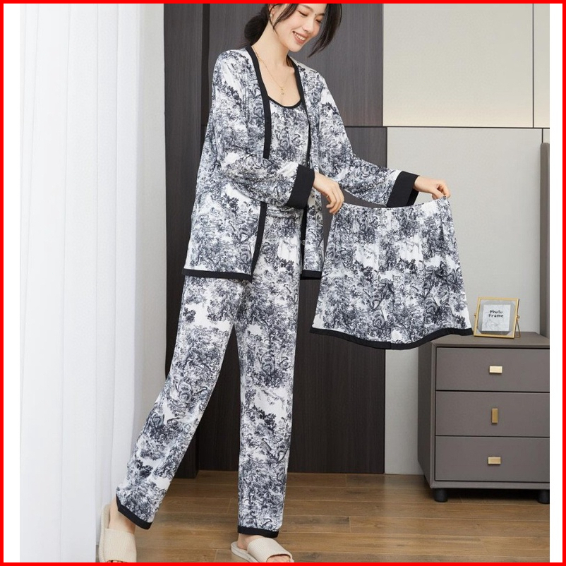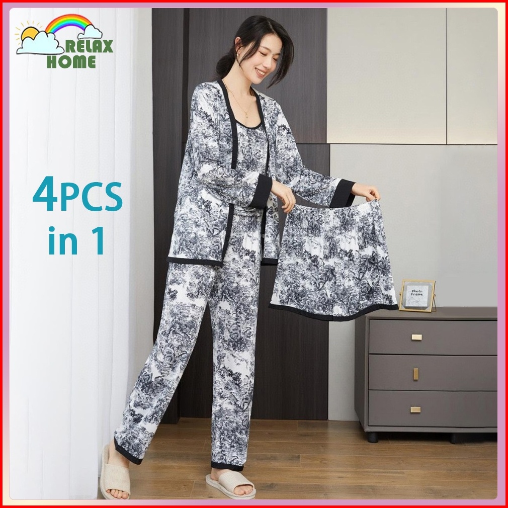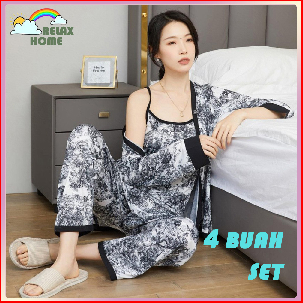 Relax Home Set Piyama Kasual Wanita 4-in-1 Tipis Sutra Es Cetak Tinta Gaya Cina Setelan Import Piyama