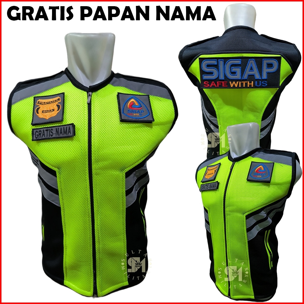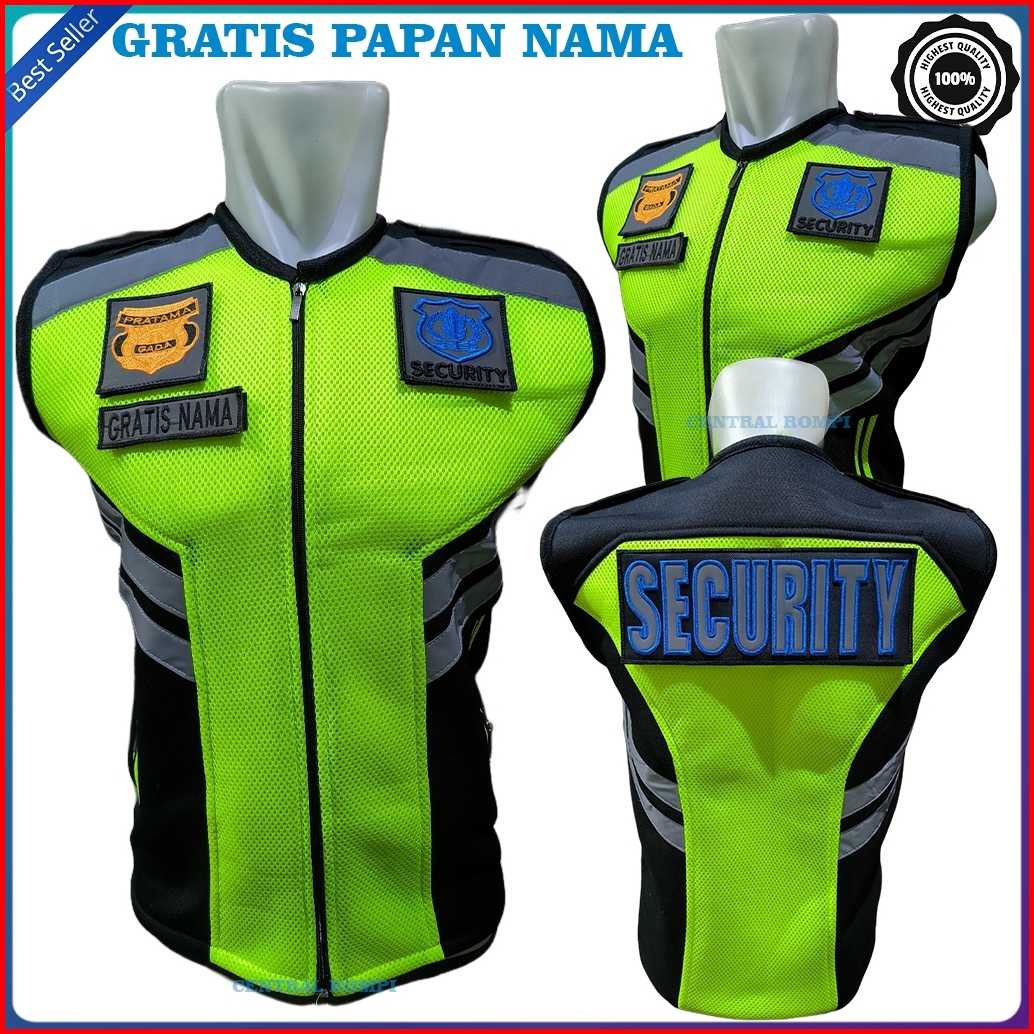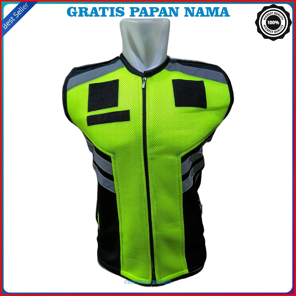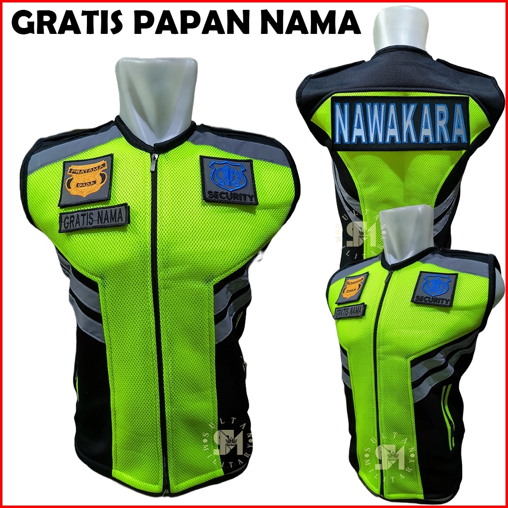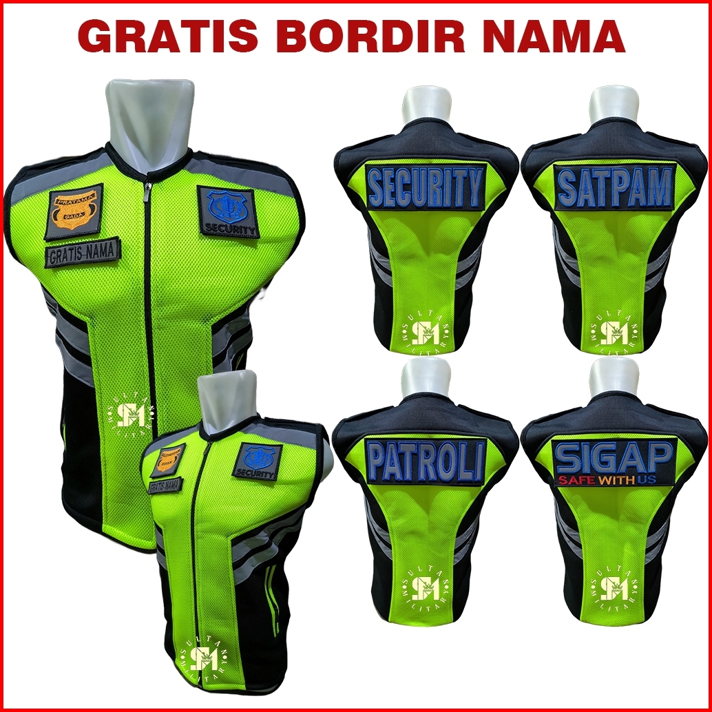 Gratis Nama - Rompi Security Satpam Bahan Double Mesh Tebal Hijau Stabilo Iga Hitam