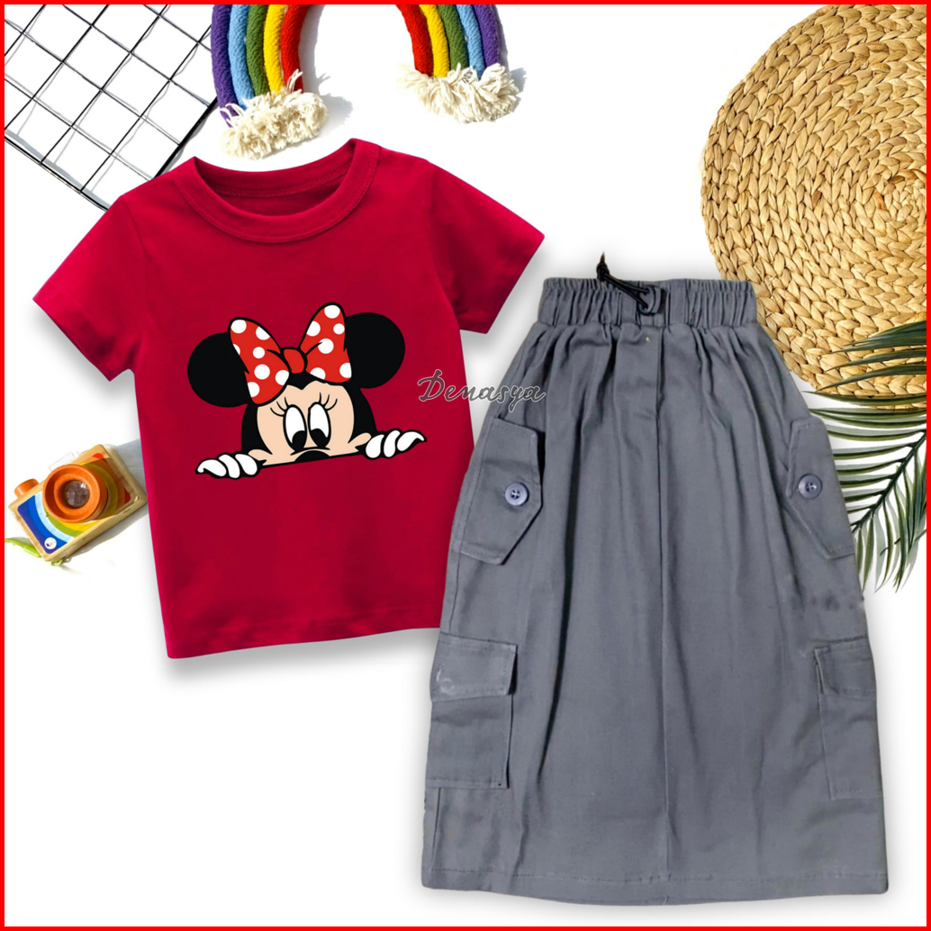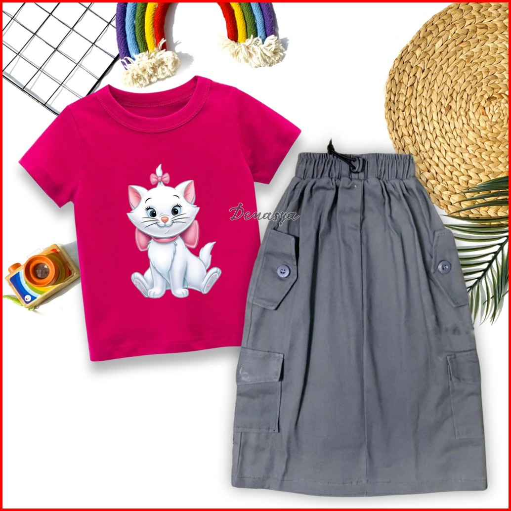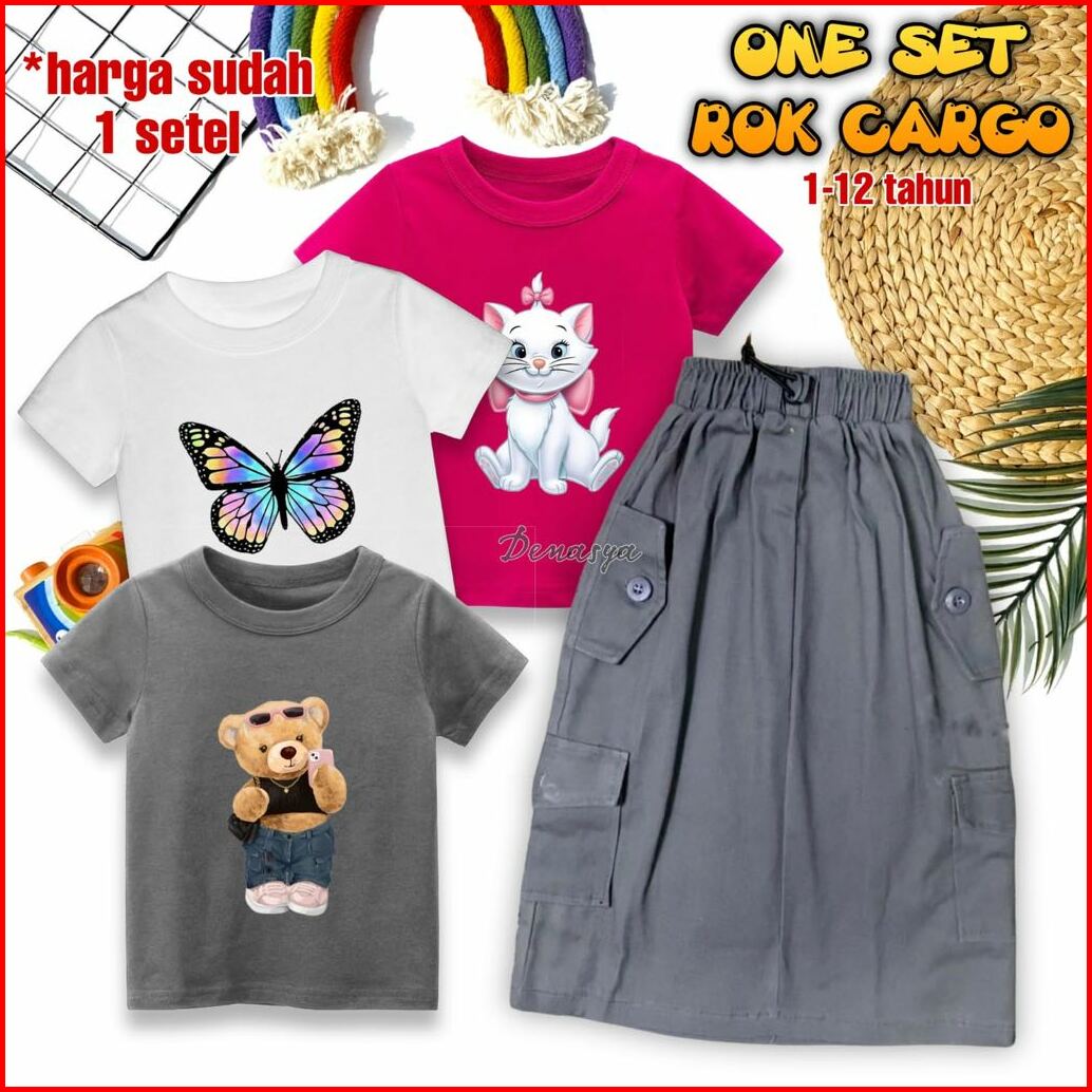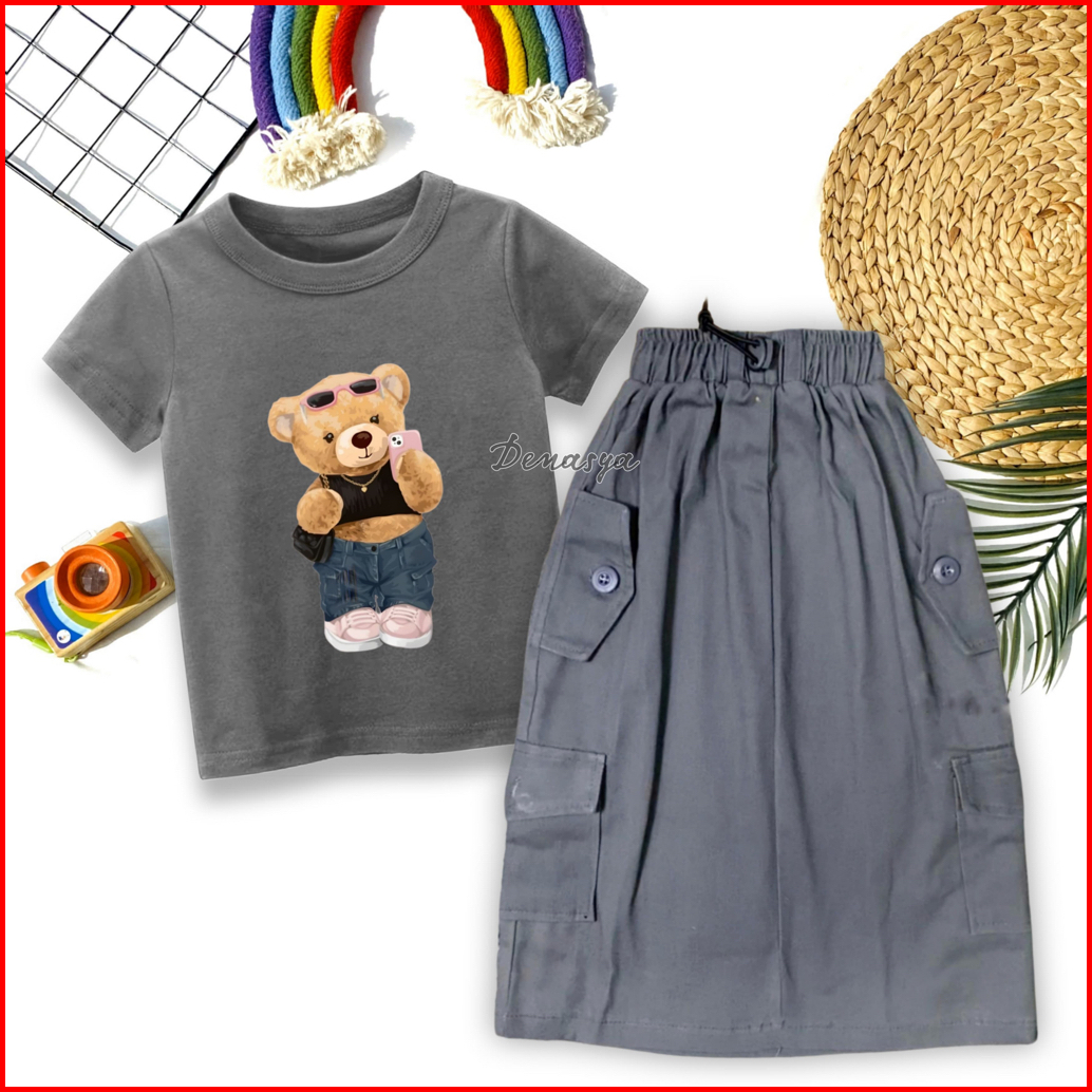 Setelan Rok Panjang Anak Perempuan Rok Cargo Katun Import Kekinian Kaos Pendek Sablon Anak Usia 1-12 Tahun