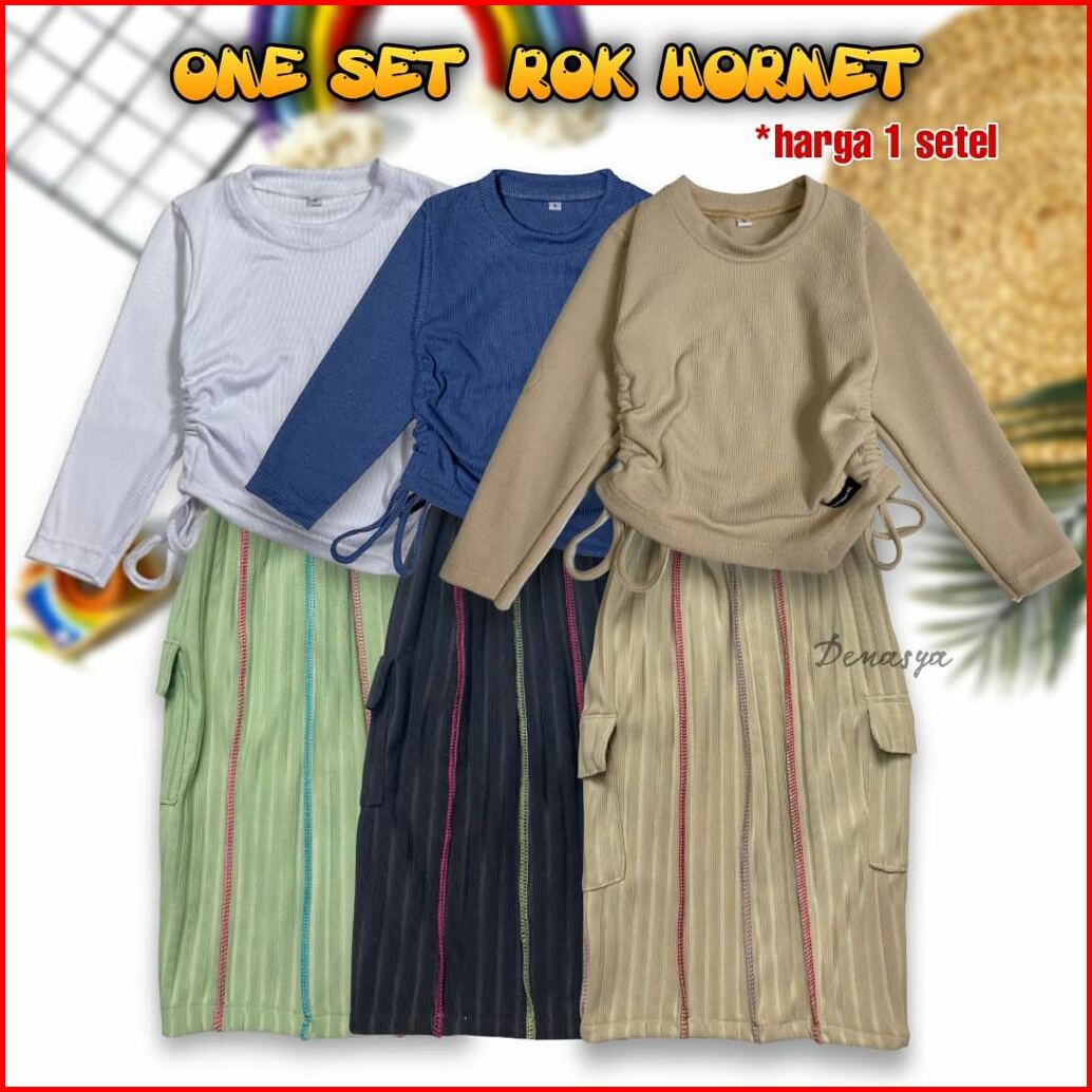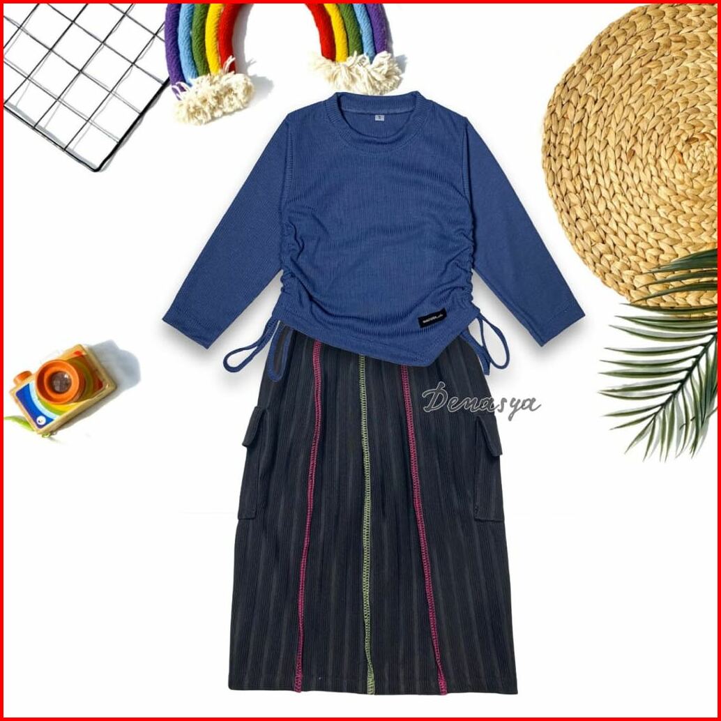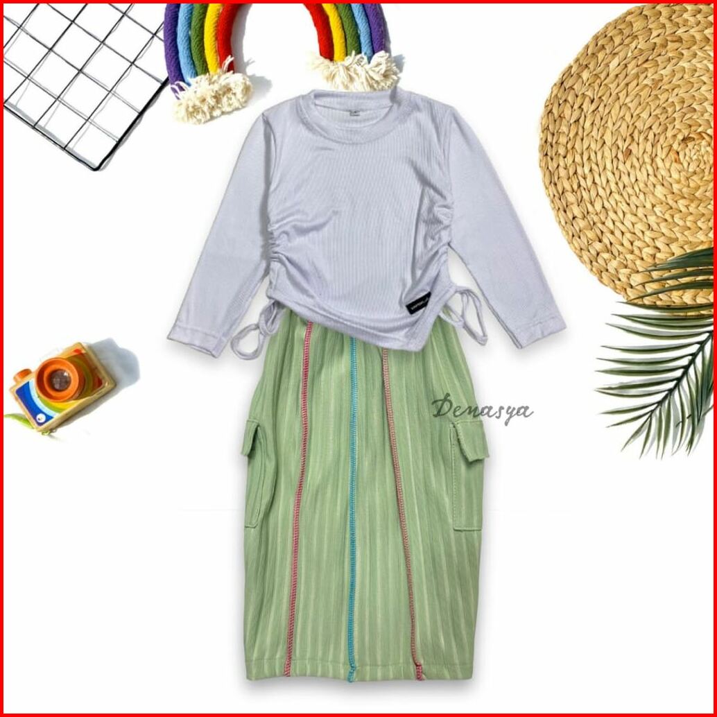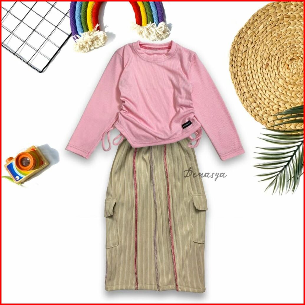 Setelan One Set Rok Kekinian Rok Hornet Cargo Anak Perempuan Kaos Knit Serut Anak Usia 6 Bulan - 12 Tahun