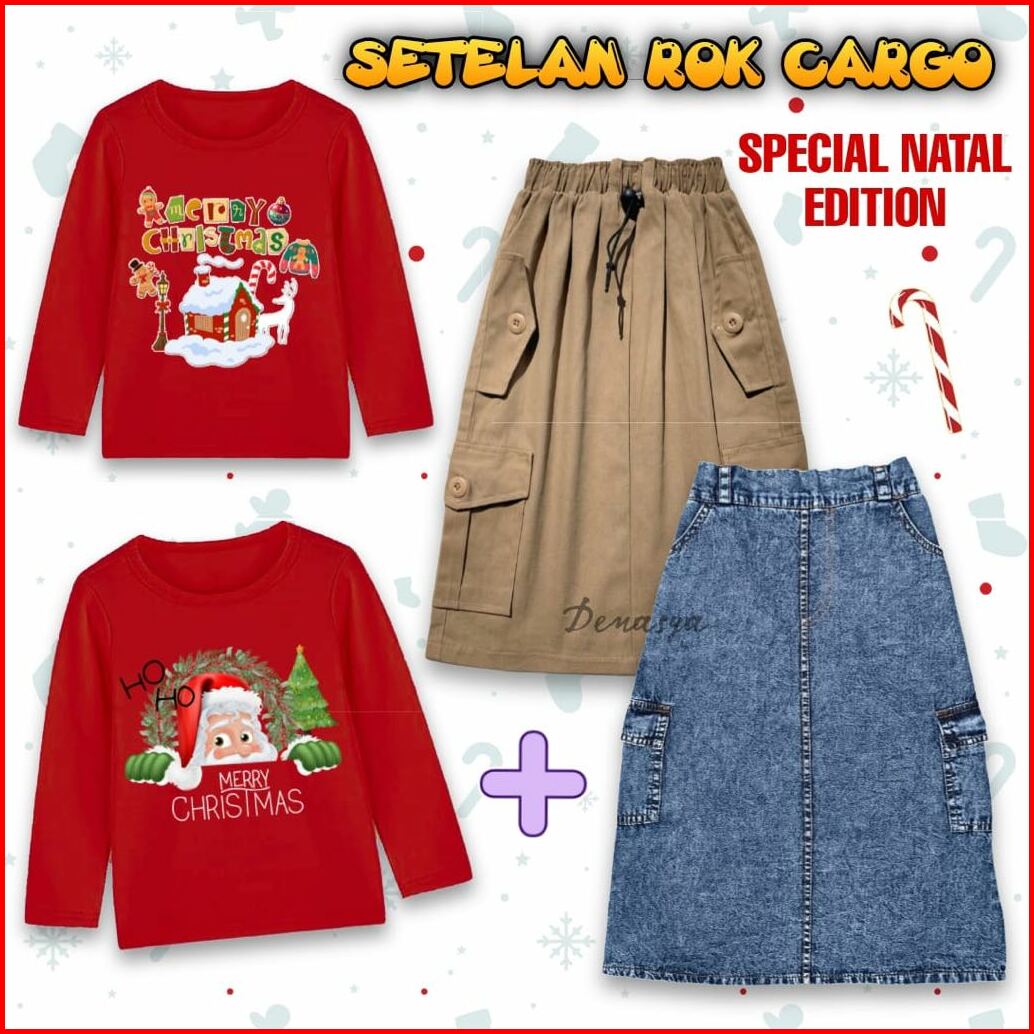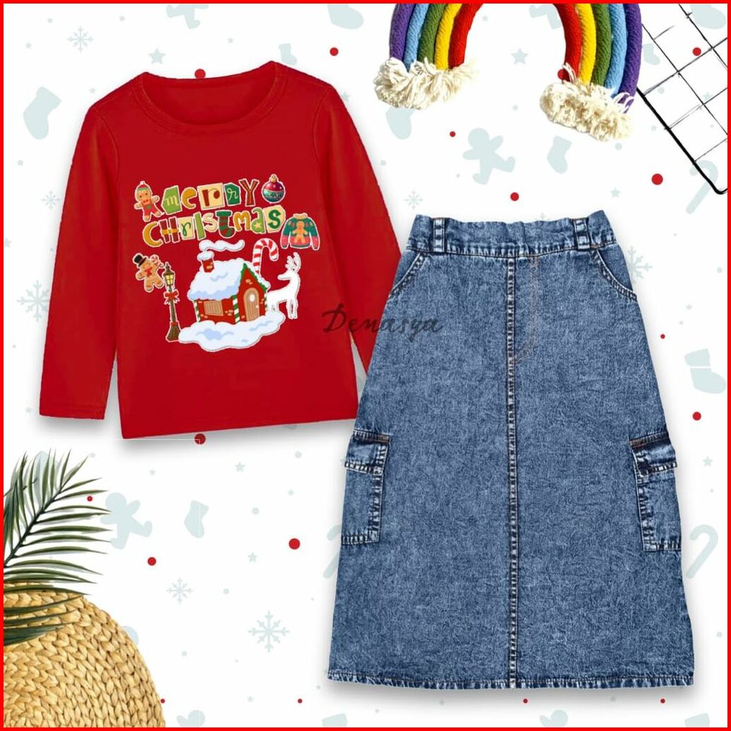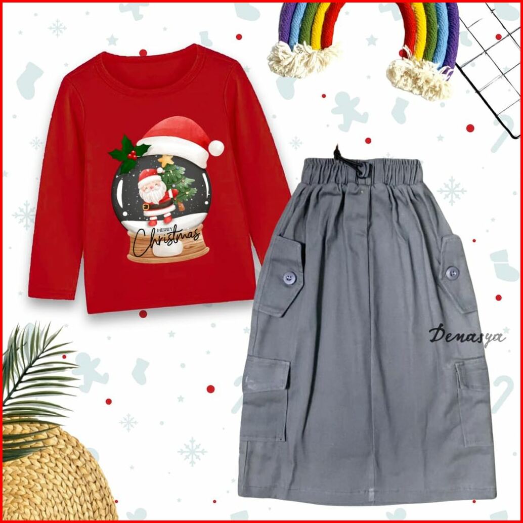 Setelan Rok Cargo Anak Perempuan Kaos Panjang Sablon Christmas Anak Kekinian Fashion Natal 2024 Terbaru Usia 2-12 Tahun