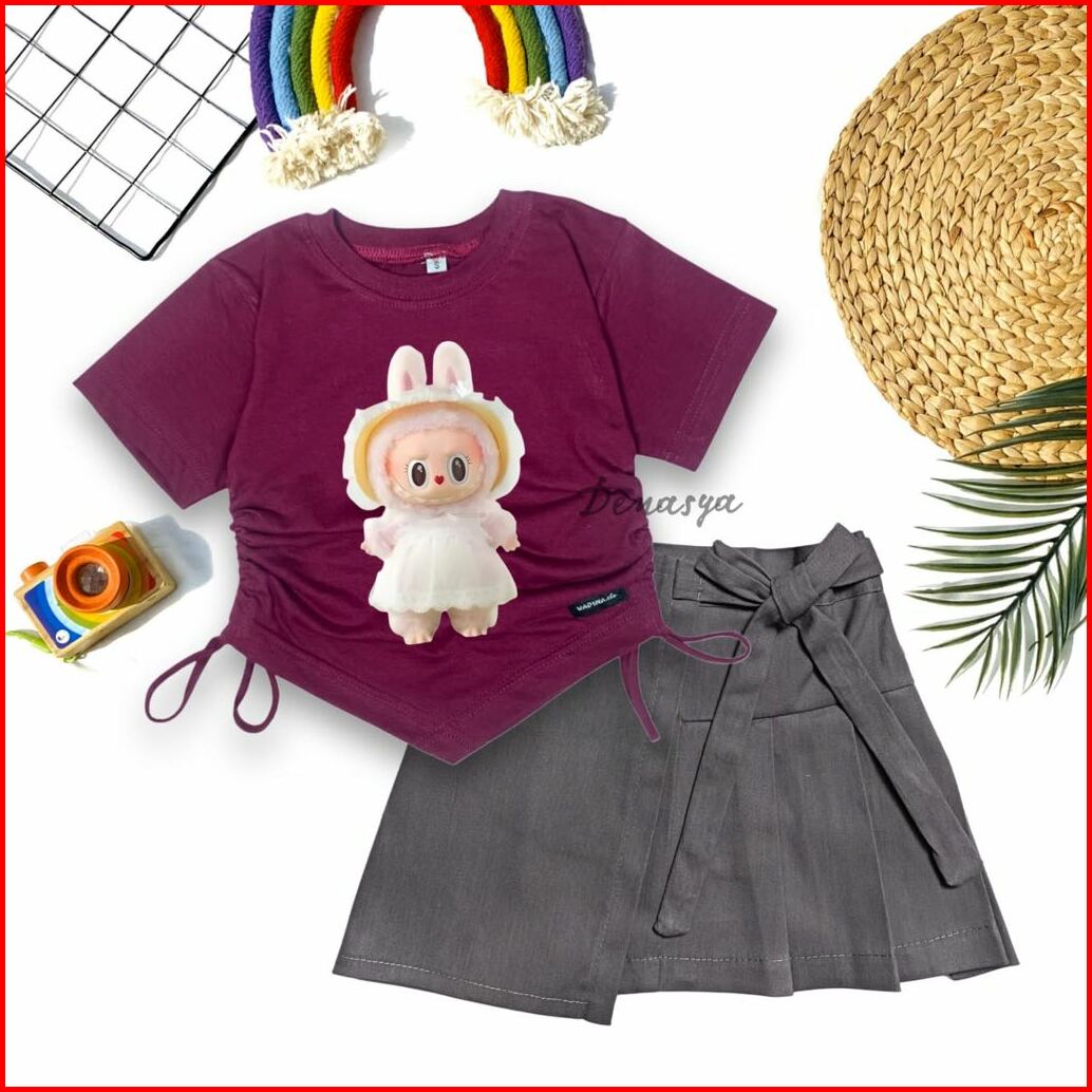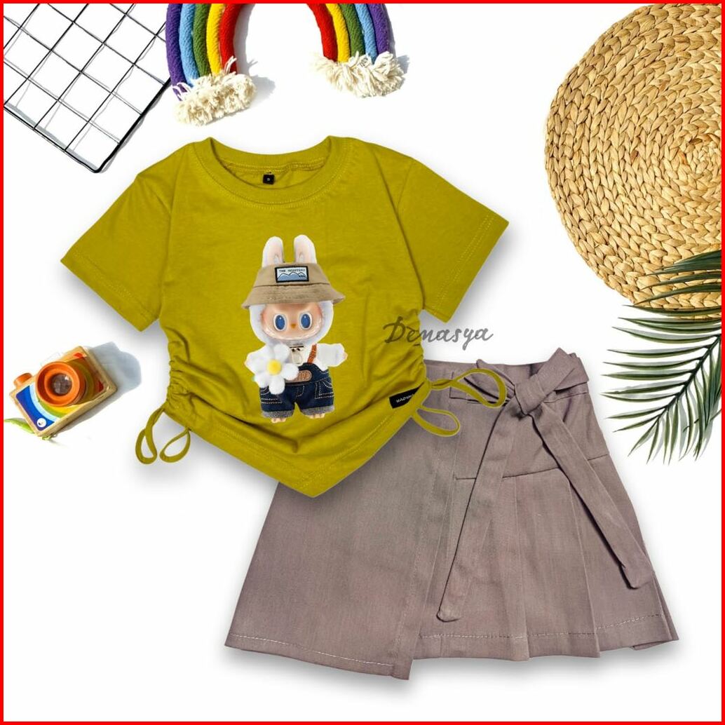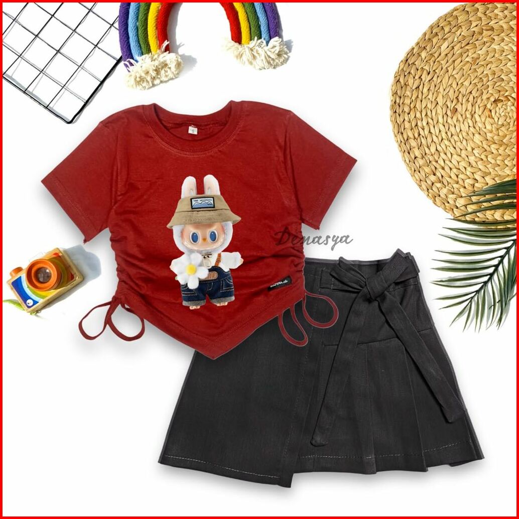 Fashion Anak Perempuan Kekinian Setelan Rok Pendek Katun Kaos Serut Croptop Motif Sablon Usia 6 Bulan - 6 Tahun