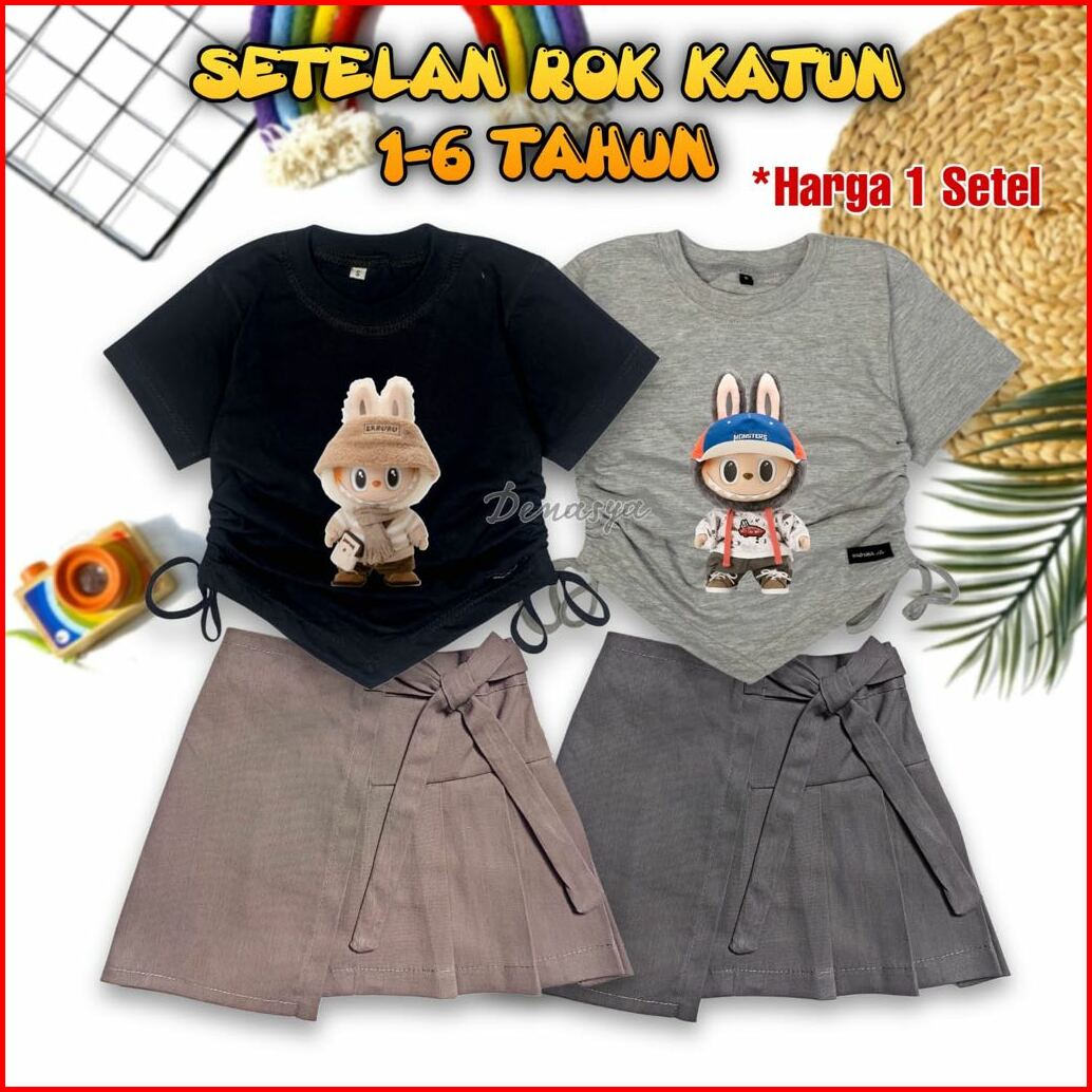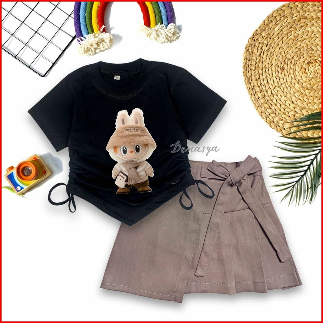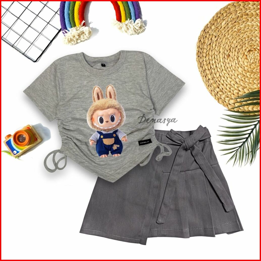 Fashion Anak Perempuan Kekinian Setelan Rok Pendek Katun Kaos Serut Croptop Motif Sablon Usia 6 Bulan - 6 Tahun