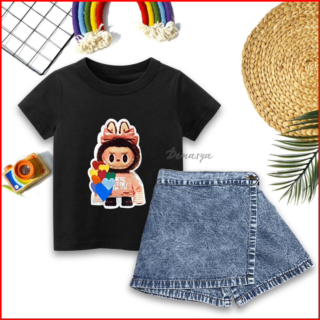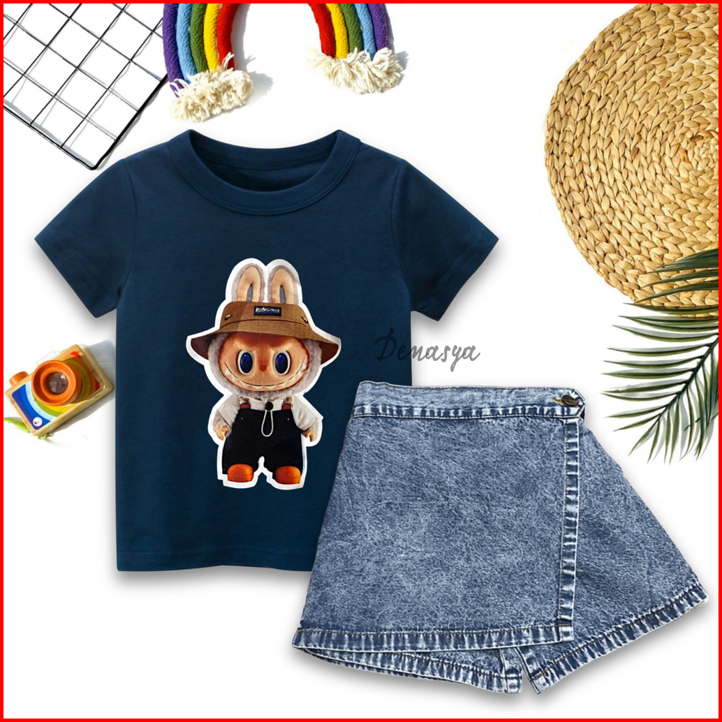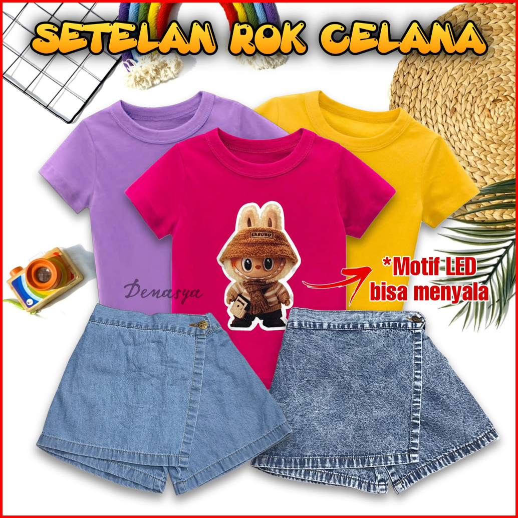 Fashion Anak Motif Labubu Setelan Rok Celana Jeans Anak Perempuan Kaos Led Bisa Menyala Usia 6 Bulan - 9 Tahun