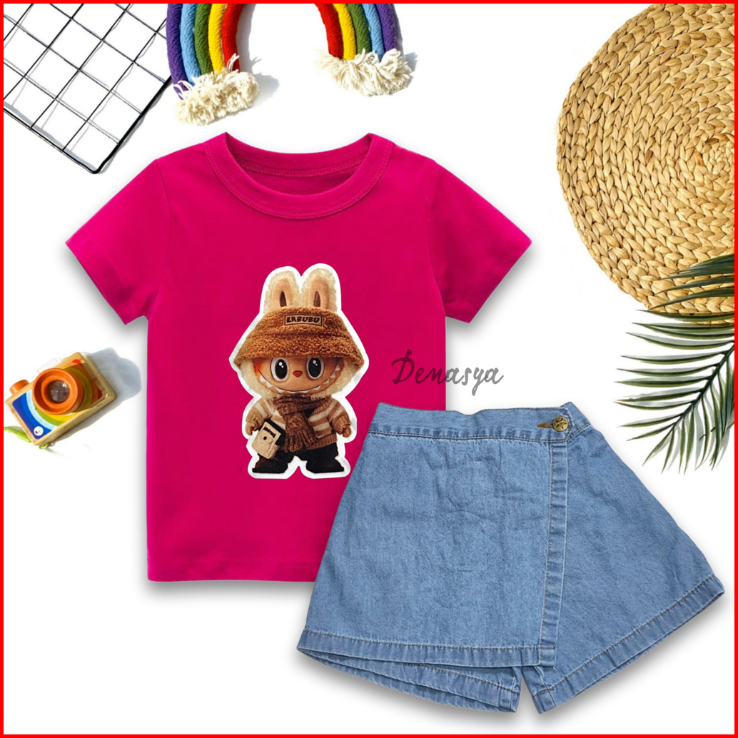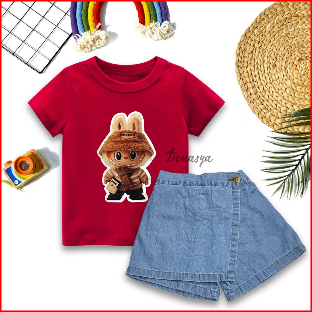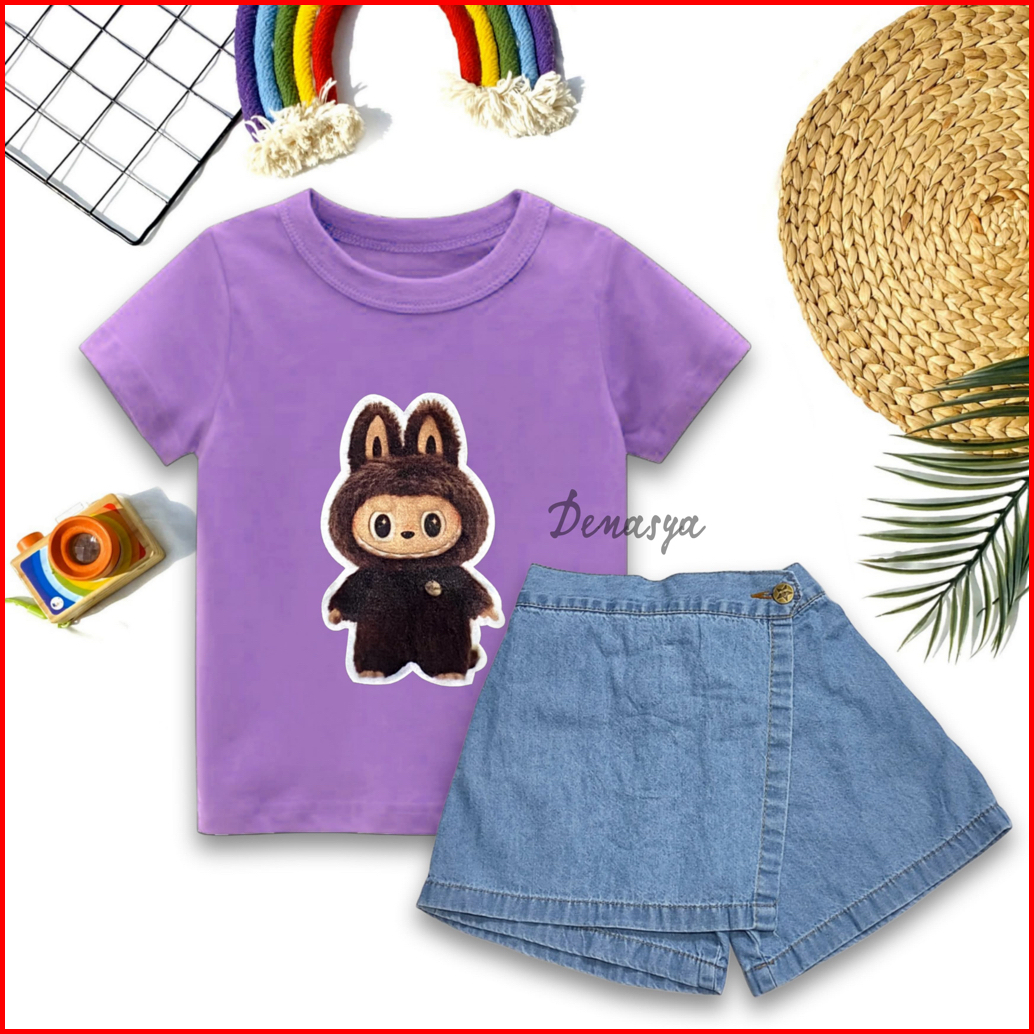 Fashion Anak Motif Labubu Setelan Rok Celana Jeans Anak Perempuan Kaos Led Bisa Menyala Usia 6 Bulan - 9 Tahun
