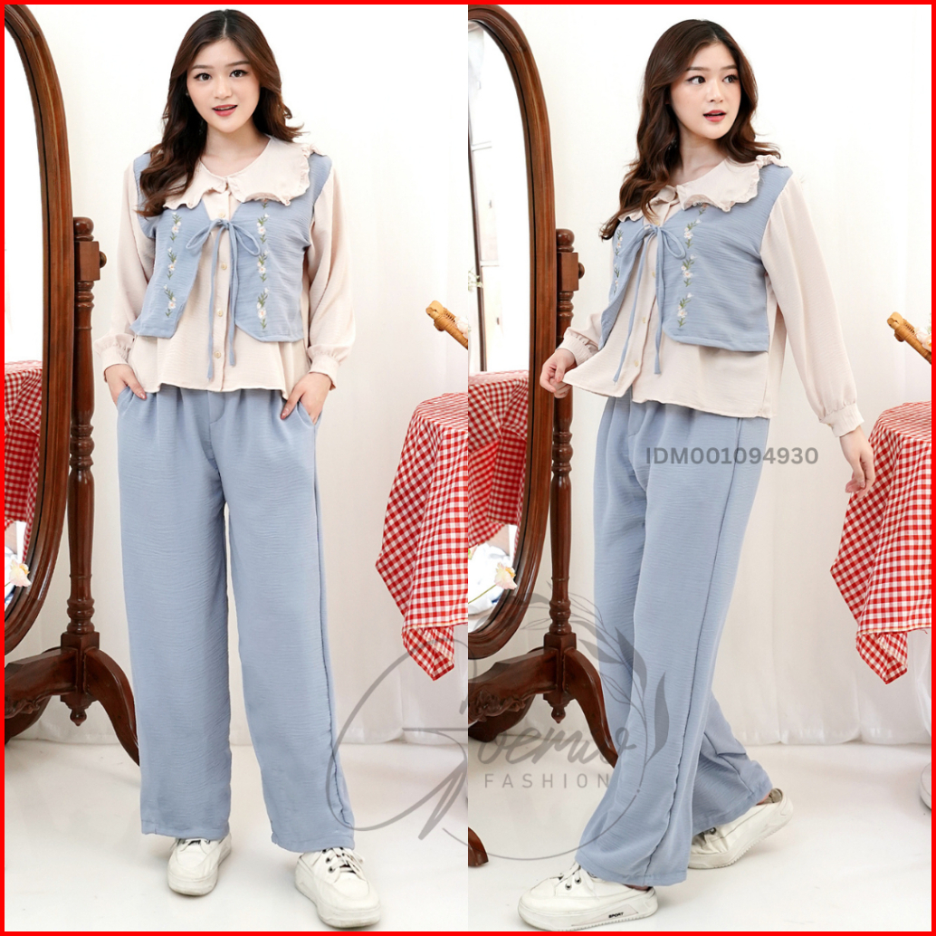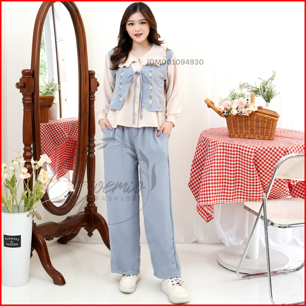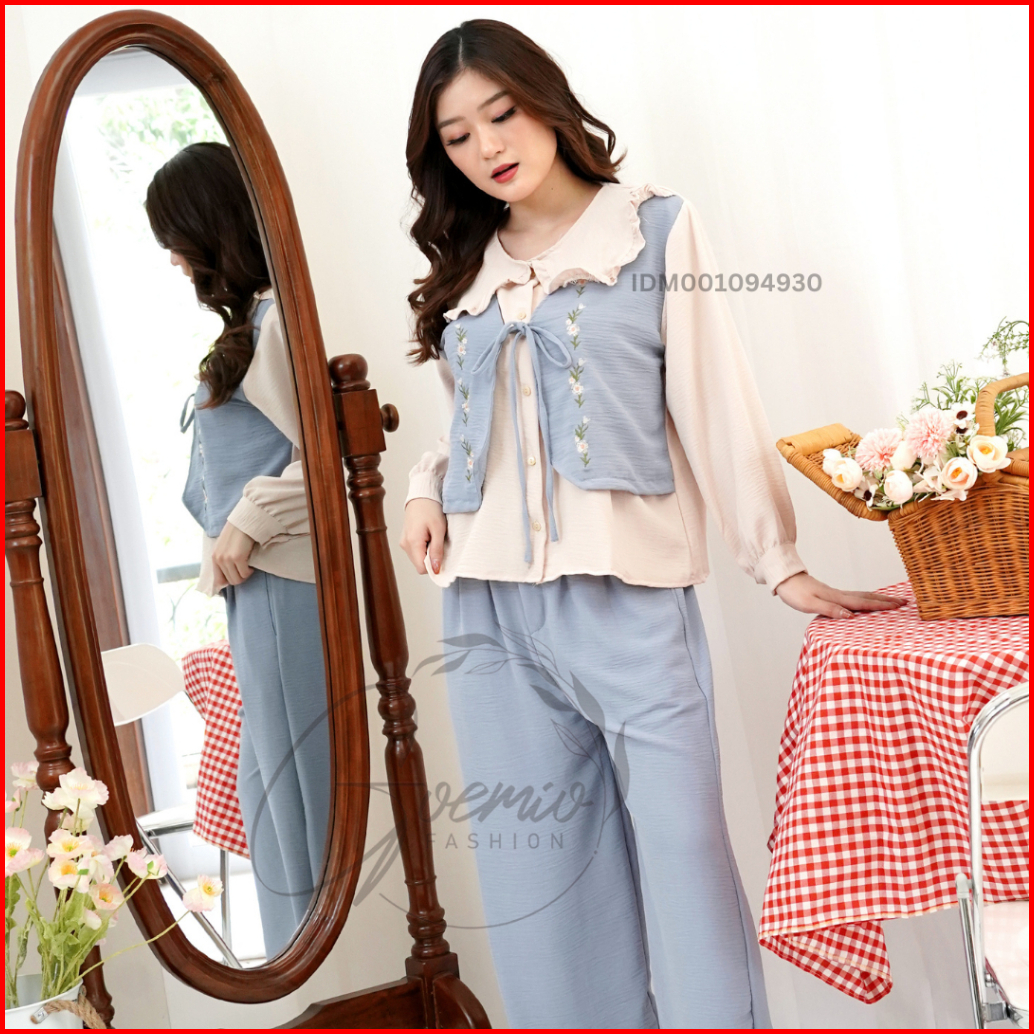 Ilook Ld 110 One Set Boram Airflow Wanita Atasan Motif Lengan Lengan Panjang Celana Highwaist