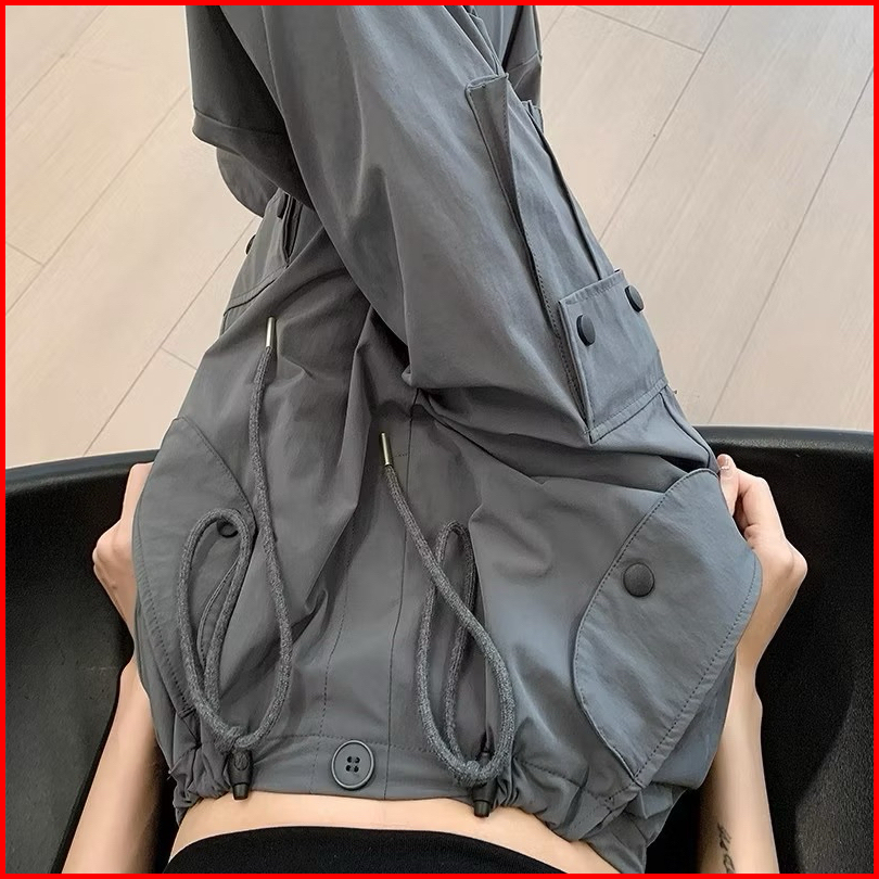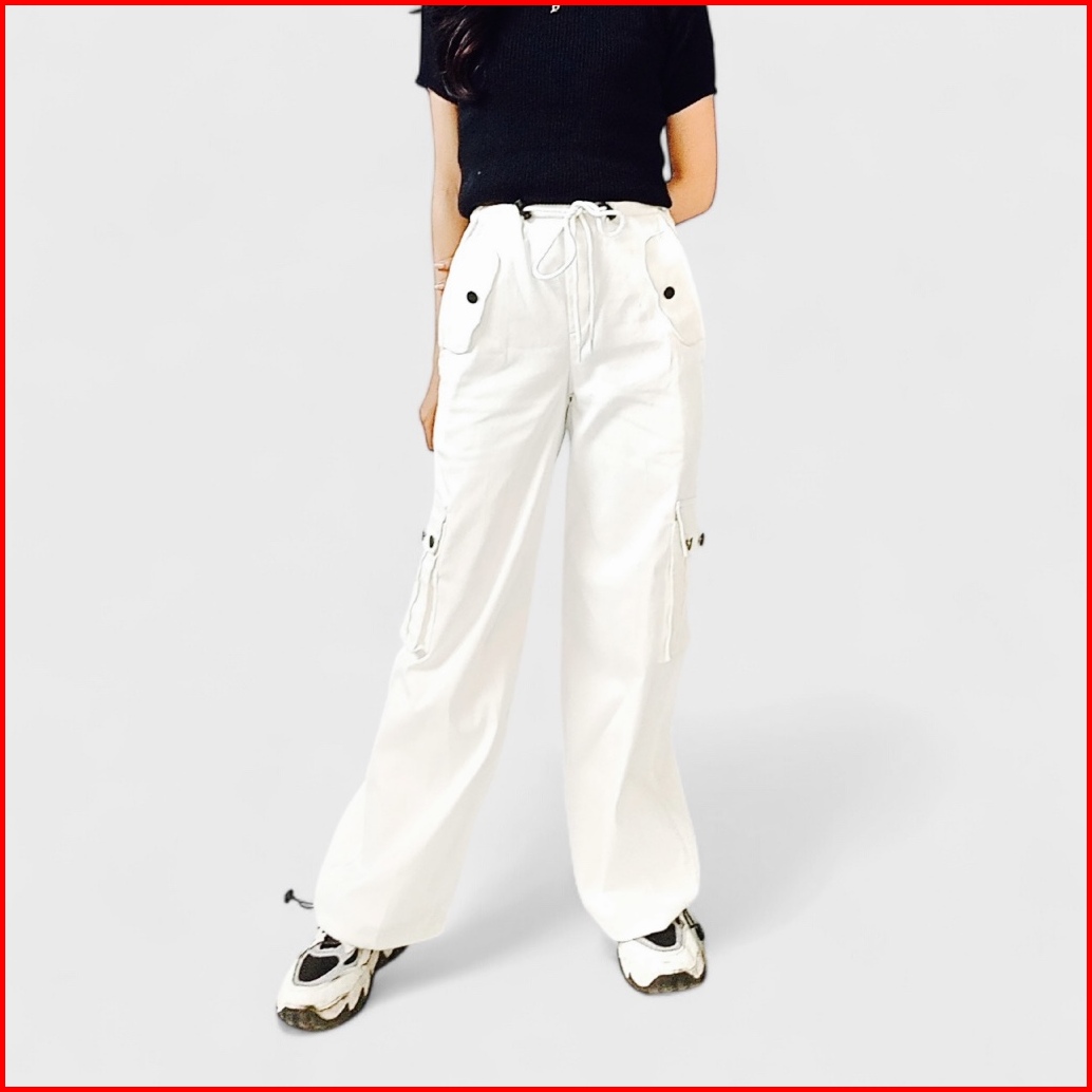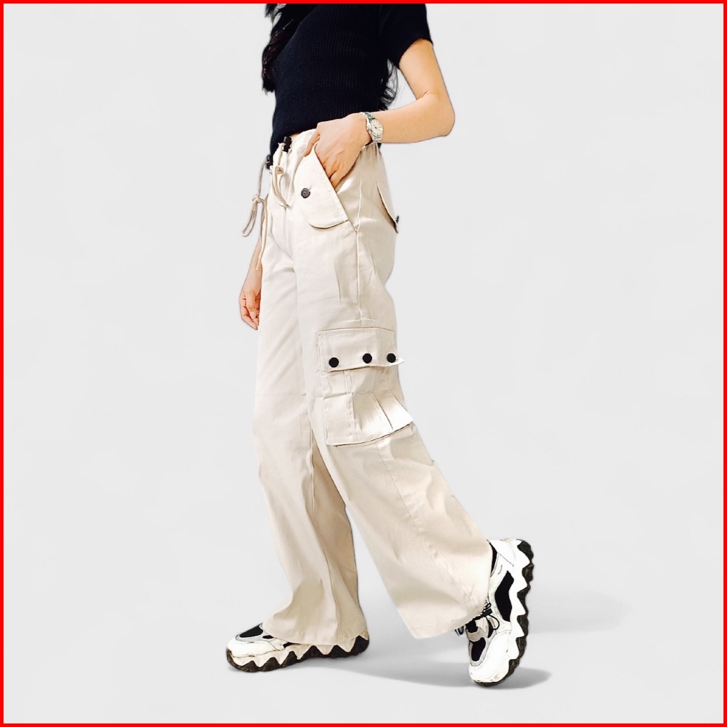 Cargo Celana Panjang Wanita Kekinian Tali Serut Korean Fashion Kasual Highwaist Loose Cargo Celana