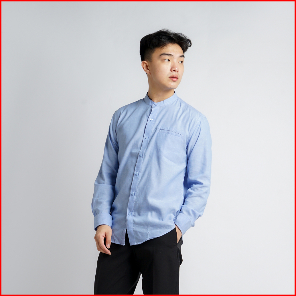 Kemeja Pria Kerah Mandarin Oxford Kumma Asta Lengan Panjang Sky Blue Soft Blue